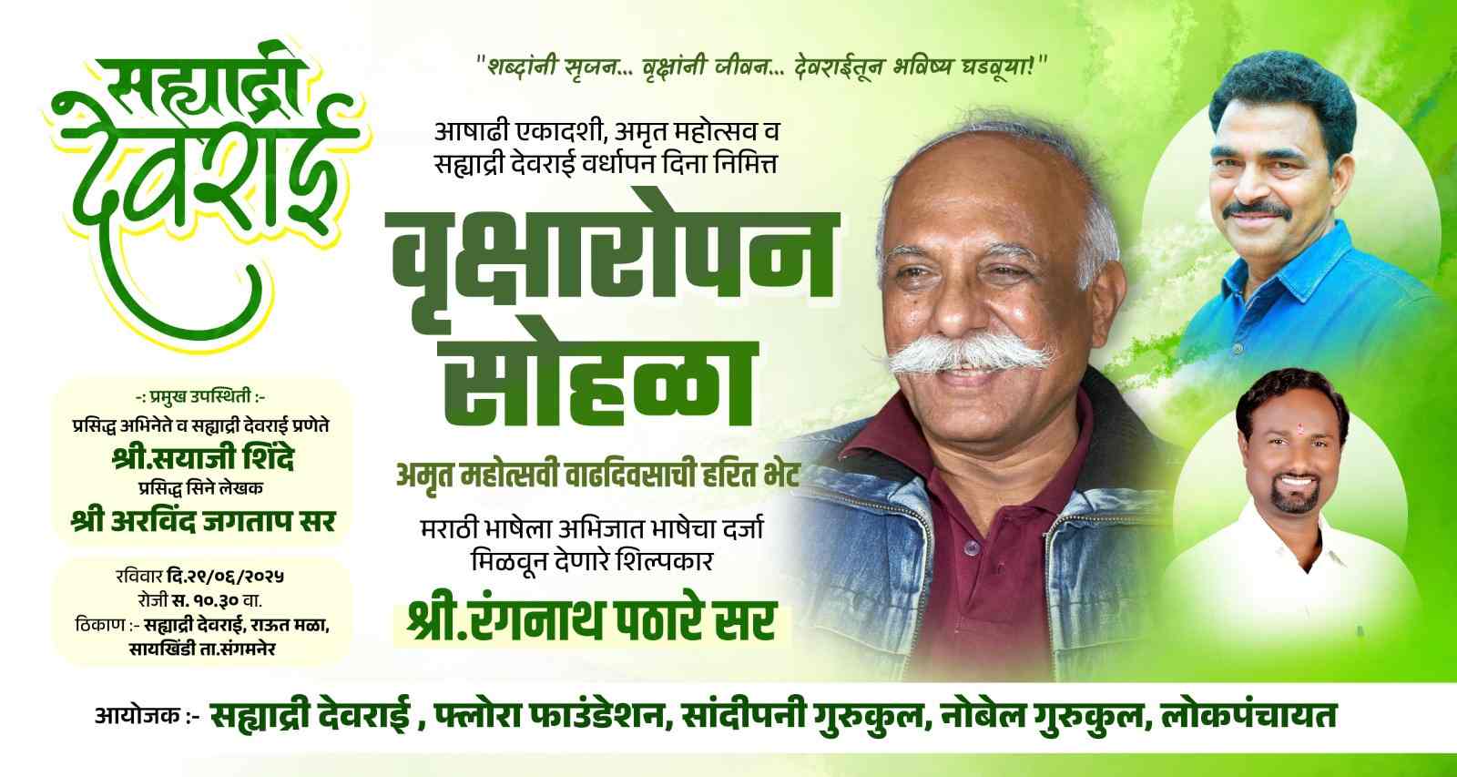 दिनांक 29 जून 2025 रोजी सकाळी ठीक 10 वाजता सह्याद्री देवराई सायखिंडी या ठिकाणी आपण या वृक्षारोपण कार्यक्रमासाठी यावे, सहभागी व्हावे, ही नम्र विनंती. या कार्यक्रमासाठी स्वतः रंगनाथ पठारे सर, प्रसिद्ध अभिनेते सयाजी शिंदे, लेखक, चित्रपट कथालेखक, अरविंद जगताप, सरपंच संसदेचे राष्ट्रीय समाज योगेश पाटील, पांडुरंग सोनवणे व अन्य निमंत्रित मान्यवर उपस्थित राहणार आहेत. अशी माहिती माजी जिल्हा परिषद सदस्य सिताराम राऊत यांनी दिली आहे.