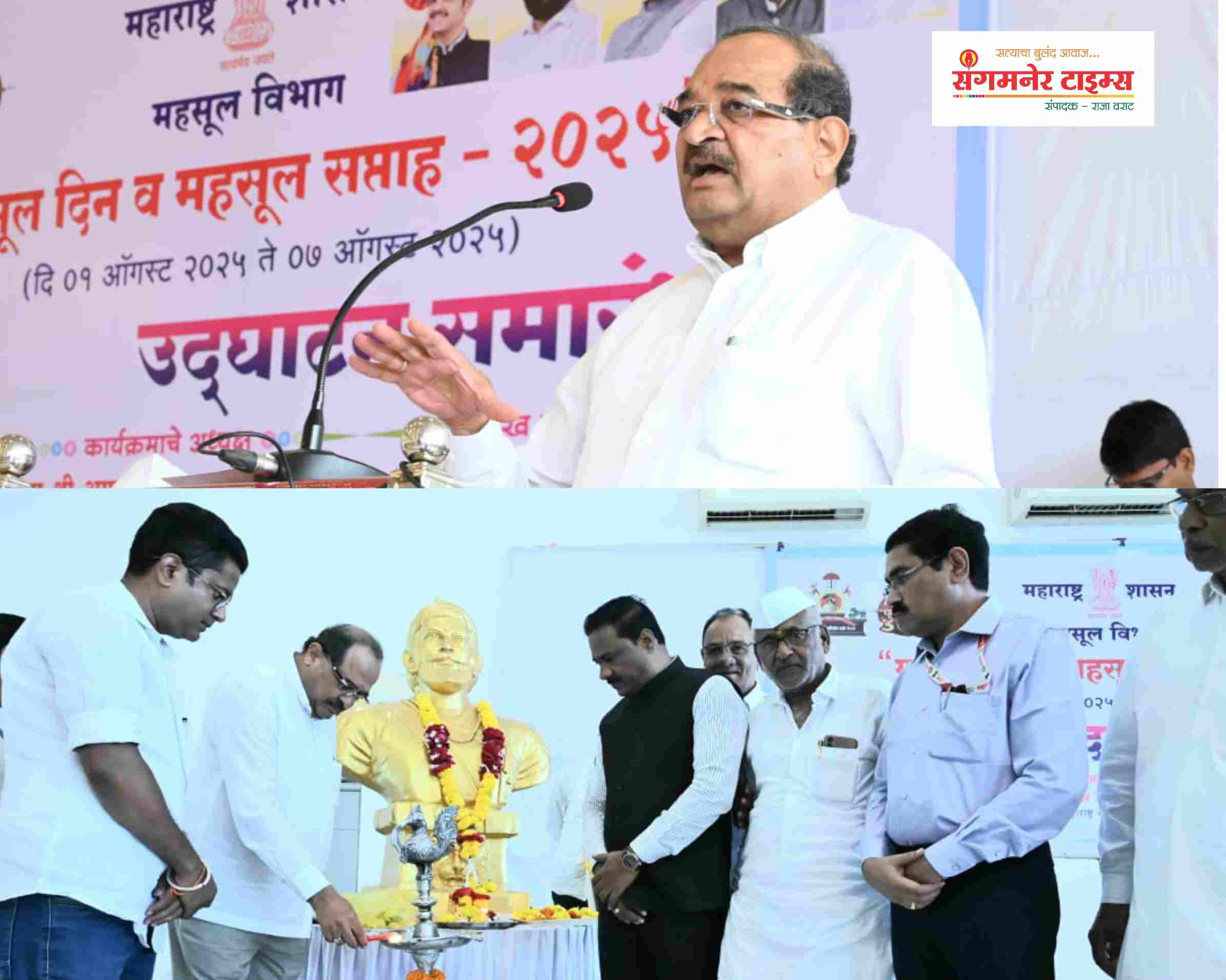 राहाता येथे महसूल विभागातर्फे आयोजित ‘महसूल सप्ताह – २०२५’ या उपक्रमाच्या उद्घाटनप्रसंगी ते बोलत होते. कार्यक्रमास माजी मंत्री तथा अहिल्यानगर जिल्हा सहकारी बँकेचे संचालक आण्णासाहेब म्हस्के पाटील, अपर जिल्हाधिकारी बाळासाहेब कोळेकर, उपविभागीय अधिकारी माणिक आहेर, उपविभागीय पोलीस अधिकारी शिरिष वमने, तहसीलदार अमोल मोरे, राहाता नगरपंचायतीचे मुख्याधिकारी वैभव लोंढे, कृषी उत्पन्न बाजार समितीचे सभापती ज्ञानेश्वर गोंदकर आदी मान्यवर उपस्थित होते.