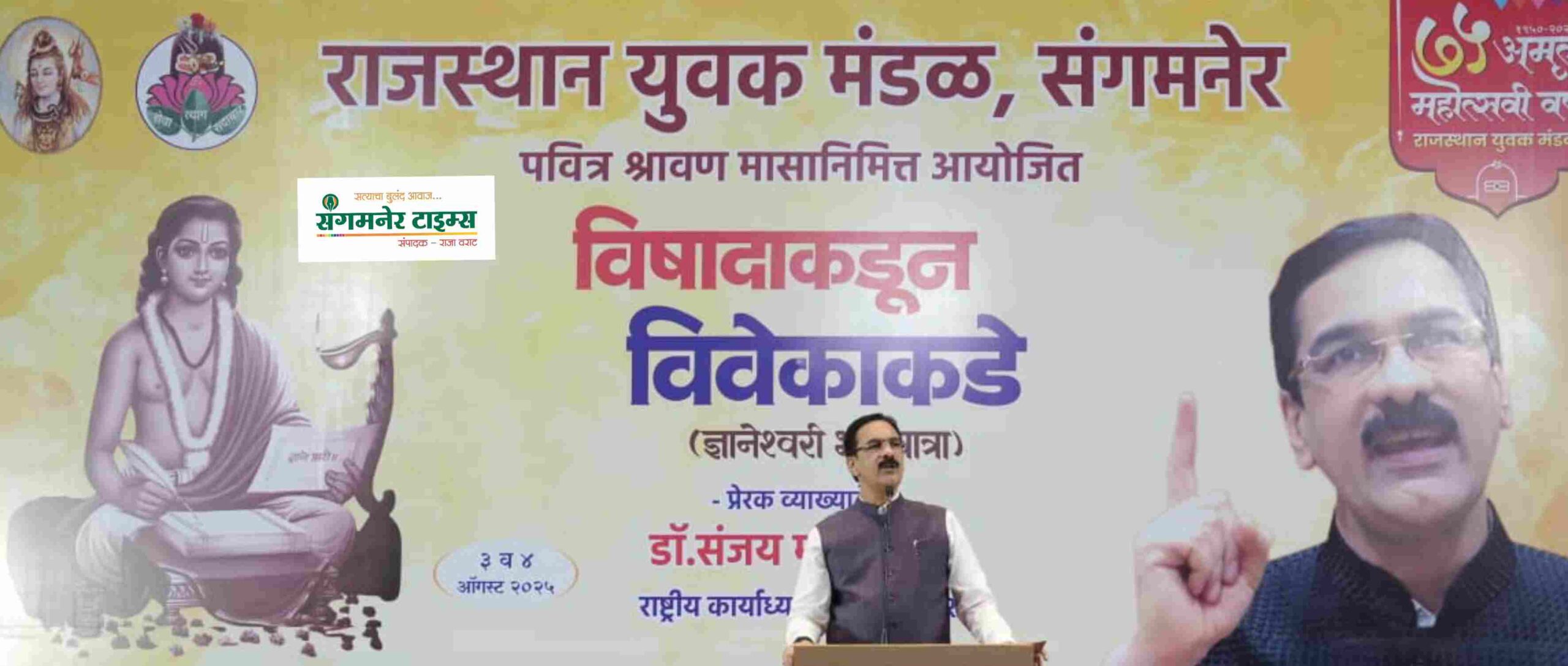 राजस्थान युवक मंडळाच्या अमृतमहोत्सवी वर्षानिमित्त आयोजित त्रिदिन अध्यात्मिक व्याख्यानमालेच्या दुसर्या दिवसाचे पुष्प गुंफताना ‘विषादाकडून विवेकाकडे’ अर्थात ‘ज्ञानेश्वरी भावयात्रा’ या विषयावर ते विवेचन करीत होते. यावेळी मंचावर प्रमुख अतिथी म्हणून प्रल्हाद शिंदे यांच्यासह मंडळाचे अध्यक्ष मनीष मालपाणी, कार्याध्यक्ष सुमीत अट्टल, उपाध्यक्ष सागर मणियार, सचिव कल्पेश मर्दा आदी उपस्थित होते.