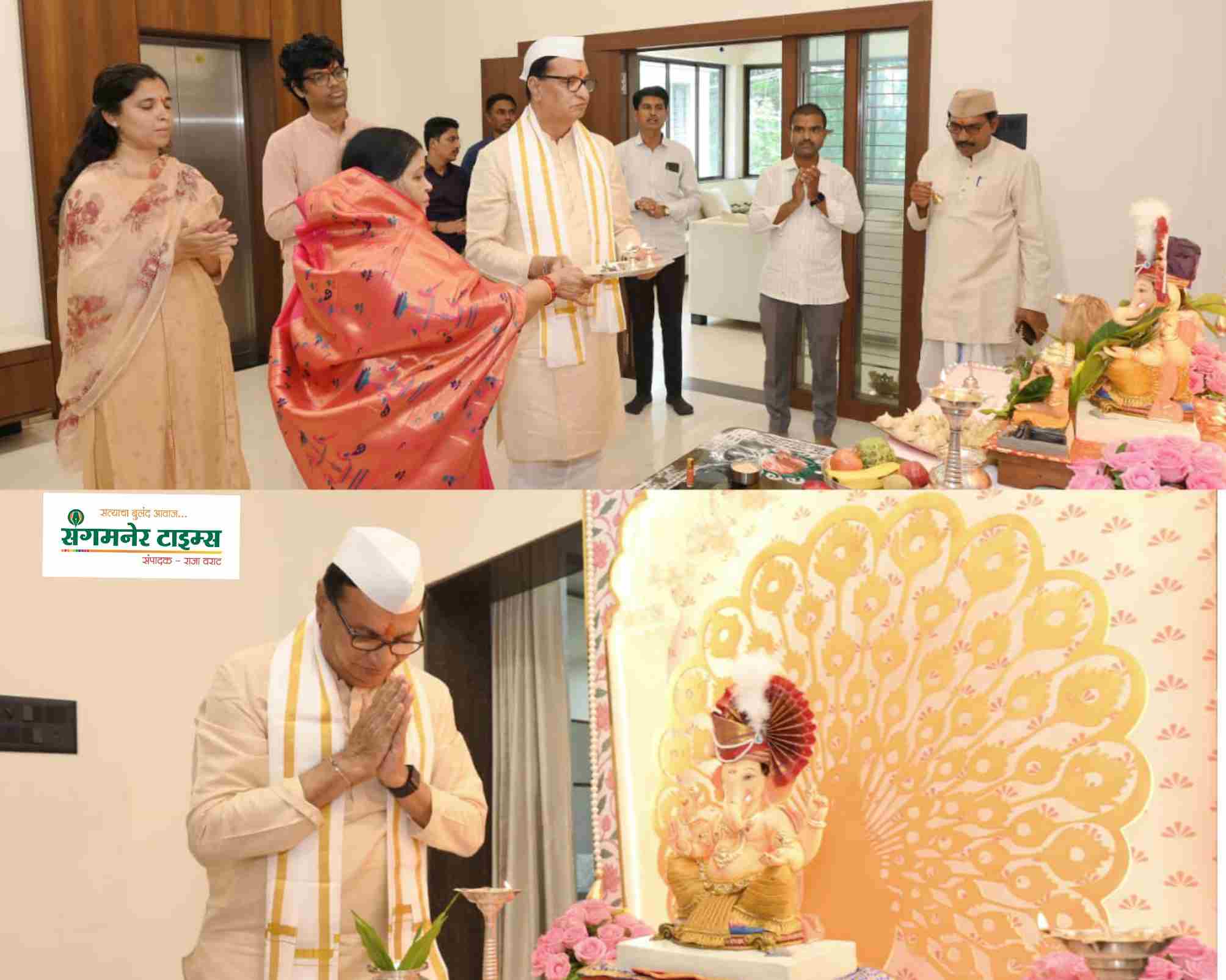 सुदर्शन निवासस्थानी श्री गणेशाची स्थापना थोरात यांच्या हस्ते झाली. यावेळी कांचनताई थोरात, कन्या डॉ जयश्रीताई थोरात, टाटा कॅन्सर हॉस्पिटलचे विभाग प्रमुख प्रा. डॉ. हसमुख जैन आदी उपस्थित होते. विधिवत पूजा करून श्री गणेशाची स्थापना यावेळी करण्यात आली.