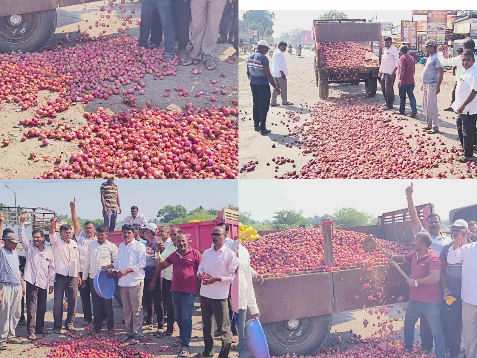 सर्व शेतकऱ्यांनी रस्त्यावर येऊन आपले सर्व कांदे रस्त्यांवरील खड्ड्यांमध्ये टाकले पाच ट्रॅक्टर कांदे रस्त्यावर आल्याने सर्व परिसर लाल कांद्यांनी भरून टाकला होता रस्त्यांवरील खड्डे दिसत नव्हते त्यामुळे सर्व कांदेच कांदे रस्त्यावर झाले होते. यावेळी तरुणांनी महायुती सरकार सरकारच्या विरोधात जोरदार घोषणाबाजी केली.