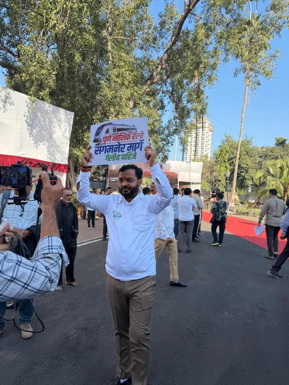 पुणे–नाशिक रेल्वे संगमनेर मार्गेच गेली पाहिजे या संगमनेरकरांच्या एकमुखी मागणीकडे राज्य सरकारचे लक्ष वेधण्यासाठी शिवसेना महायुतीचे आमदार अमोल खताळ यांनी मागणीचे घोषवाक्य लिहिलेला टी-शर्ट परिधान करत हातात फलक घेऊन थेट नागपूरच्या विधान भवनात लक्षवेधी आंदोलन केले.