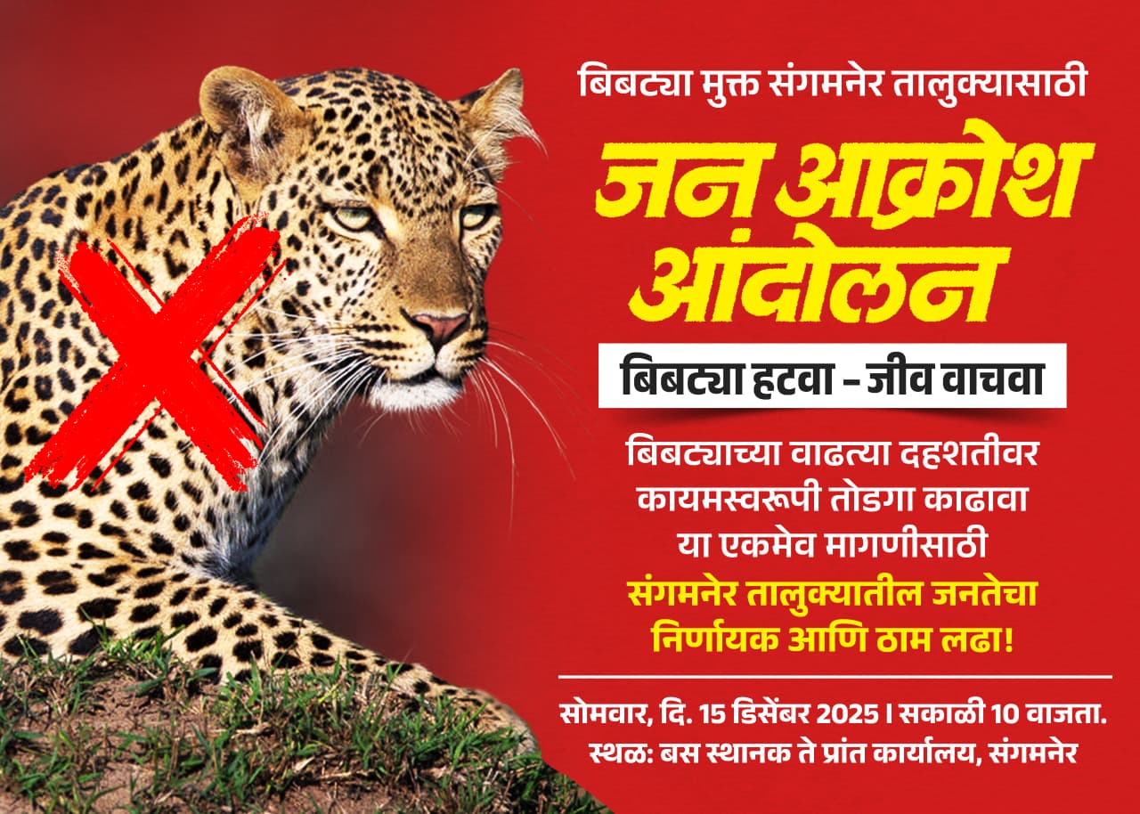 ‘बिबट्यामुक्त संगमनेर तालुका’ यासाठी सरकार व वन विभागाच्या विरोधातही भव्य जन आक्रोश संगमनेर तालुक्यामध्ये बिबट्याची संख्या मोठ्या प्रमाणात वाढली आहे. यामुळे शेतकरी नागरिक लहान मुले यांच्यामध्ये मोठी भीती निर्माण झाली आहे. जवळेकडलग येथील लहानग्या सिद्धेश ला आपला जीव गमावा लागला. याचबरोबर अनेक नागरिकांवर सातत्याने नरभक्षक बिबट्यांनी हल्ले केले आहेत. वेळोवेळी मागणी करूनही शासनाकडून कोणतीही ठोस उपाययोजना होत नसल्याने संगमनेर तालुक्यातील तमाम जनतेच्या वतीने सोमवार दिनांक 15 डिसेंबर 2025 रोजी सकाळी दहा वाजता संगमनेर बस स्थानक ते प्रांत कार्यालय या ठिकाणी भव्य जन आक्रोश मोर्चा काढण्यात येणार आहे असे डॉ. थोरात यांनी सांगितले आहे.