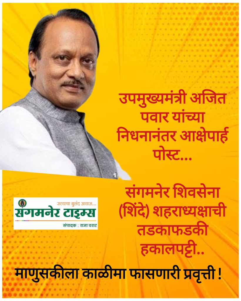 राज्याचे उपमुख्यमंत्री अजित पवार यांच्या विमान अपघातातील दुर्दैवी निधनानंतर संपूर्ण महाराष्ट्र शोकसागरात बुडालेला असताना, संगमनेरमध्ये एक धक्कादायक प्रकार समोर आला आहे. शिवसेना (शिंदे गट) संगमनेर शहराध्यक्ष दिनेश भीमाशंकर फटांगरे यांनी सोशल मीडियावर अजित पवार यांच्या संदर्भात एक अत्यंत वादग्रस्त आणि आक्षेपार्ह पोस्ट केली होती. या कृत्यामुळे राजकीय वर्तुळात संतापाची लाट उसळल्यानंतर, पक्षाने त्यांची तात्काळ पदावरून हकालपट्टी केली आहे. फटांगरे यांचा सर्व स्तरातून निषेध होत आहे.