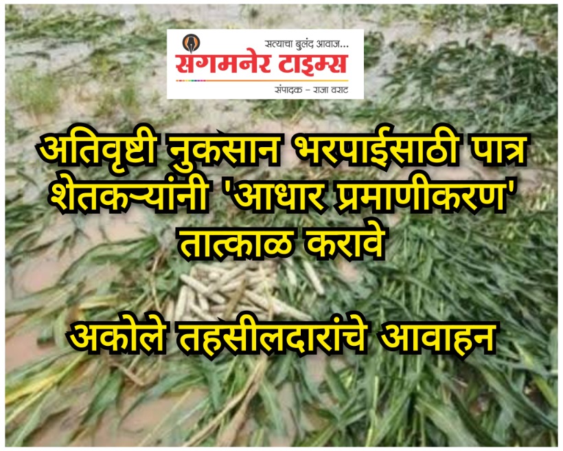 ऑक्टोबर २०२५ मध्ये झालेल्या अतिवृष्टीमुळे पिकांचे नुकसान झालेल्या अकोले तालुक्यातील शेतकऱ्यांसाठी राज्य शासनाने नुकसान भरपाई जाहीर केली आहे. ही अनुदानाची रक्कम थेट लाभ हस्तांतरण प्रक्रियेद्वारे शेतकऱ्यांच्या बँक खात्यात जमा करण्यात येणार असून ती विनाअडथळा प्राप्त करण्यासाठी पात्र शेतकऱ्यांनी आपले ‘आधार प्रमाणीकरण’ तातडीने पूर्ण करावे, असे आवाहन तहसीलदार सिद्धार्थ मोरे यांनी केले आहे.