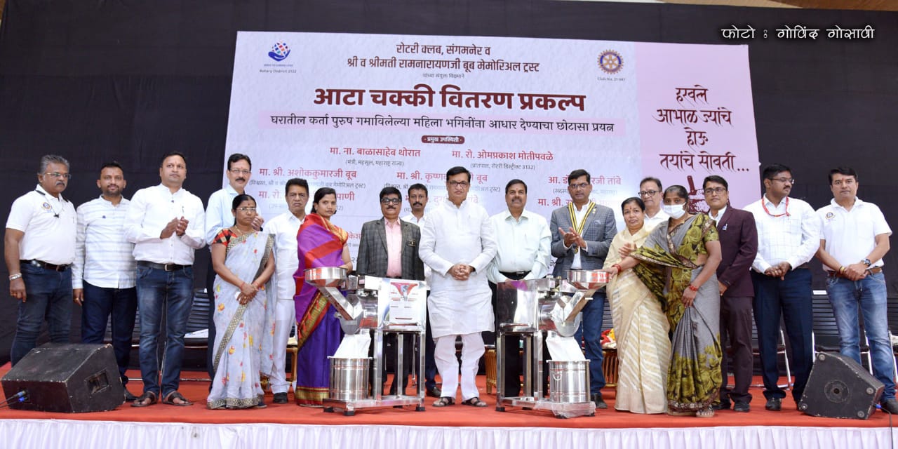 सामाजिक कार्यात नेहमी अग्रेसर असणाऱ्या रोटरी क्लब ऑफ संगमनेर व त्यांच्या कार्याला नेहमी पाठबळ देणाऱ्या श्री व श्रीमती रामानारायणजी बूब मेमोरिअल ट्रस्टमार्फत घरातील कर्ता पुरुष गमाविलेल्या १११ महिलांना मोफत आटा चक्कीचे वाटप करण्यात आले.