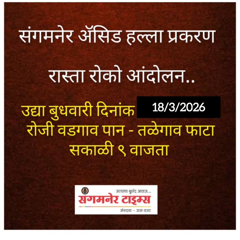संगमनेर तालुक्यातील वडगावपान येथील इयत्ता:- ६ वी ची विदयार्थीनी कु.ईश्वरी (वय:-१३वर्ष) हिच्यावर झालेल्या भ्याड ऍसिड हल्ल्याच्या निषेधार्थ वडगावपान मधील सर्व संस्थाचे पदाधिकारी तसेच गावातील सर्व ग्रामस्थ महिला भगिनी यांच्या वतीने निषेध व्यक्त करण्यासाठी रास्ता रोको आंदोलन उद्या दि.१८-०३-२०२६ रोजी करण्यात येणार आहे.