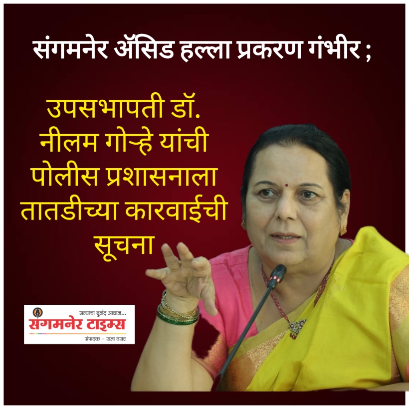 संगमनेर (जि. अहिल्यानगर) येथे १२ वर्षीय अल्पवयीन मुलीवर झालेल्या ॲसिड हल्ल्याच्या अत्यंत गंभीर घटनेची विधान परिषद उपसभापती डॉ. नीलम गोऱ्हे यांनी दखल घेतली असून, या प्रकरणात कोणतीही त्रुटी राहू नये यासाठी कठोर आणि तातडीने कारवाई करण्याचे निर्देश त्यांनी नाशिक परिक्षेत्राच्या विशेष पोलीस महानिरीक्षकांना दिले आहेत.