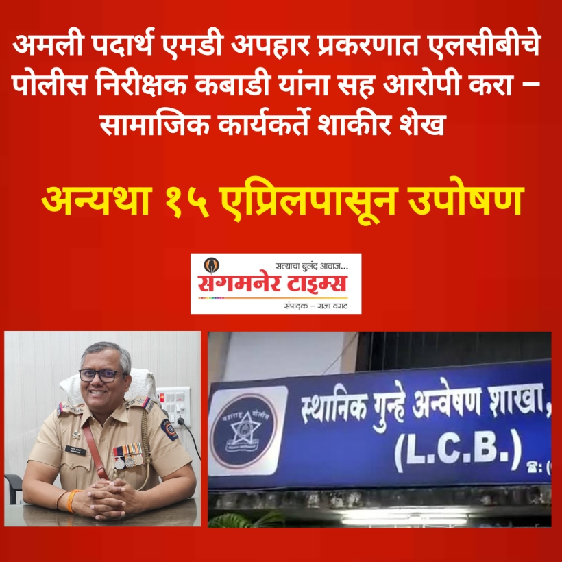 अहिल्यानगर पोलीस मुख्यालयातील अमली पदार्थ साठवणूक केंद्रातून मोठ्या प्रमाणात एमडी (मेफेड्रोन) या अंमली पदार्थाच्या अपहार प्रकरणात स्थानिक गुन्हे शाखेचे पोलीस निरीक्षक किरणकुमार कबाडी यांना निलंबित करून सहआरोपी करण्यात यावे, अशी मागणी सामाजिक कार्यकर्ते शाकिर शेख यांनी राज्याचे गृहमंत्री यांच्याकडे केली आहे. तसेच १५ एप्रिलपर्यंत कारवाई न झाल्यास नाशिक येथील विशेष पोलीस महानिरीक्षक कार्यालयासमोर उपोषणास बसण्याचा इशाराही त्यांनी दिला आहे.