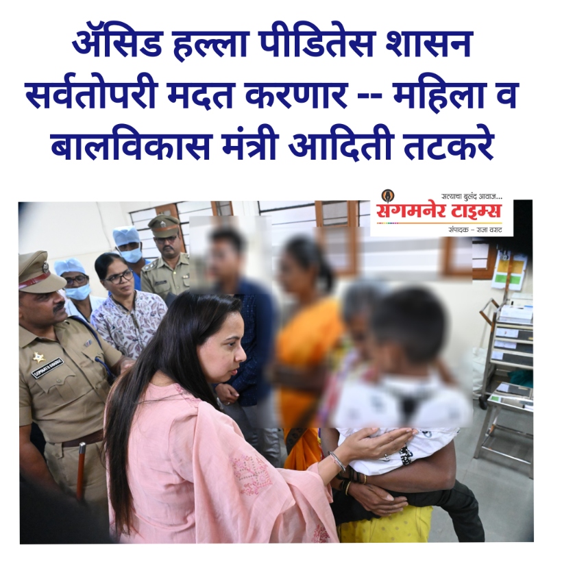 संगमनेर तालुक्यातील वडगावपान येथील ॲसिड हल्ल्यातील पीडित मुलीची महिला व बालविकास मंत्री आदिती तटकरे यांनी रविवारी लोणी येथील प्रवरा रुग्णालयात जाऊन भेट घेतली. या अत्यंत निंदनीय घटनेतील पीडित मुलीच्या पाठीशी शासन खंबीरपणे उभे आहे आणि तिच्या पुढील उपचारांचा संपूर्ण खर्च शासन करेल, अशी ग्वाही तटकरे यांनी दिली.