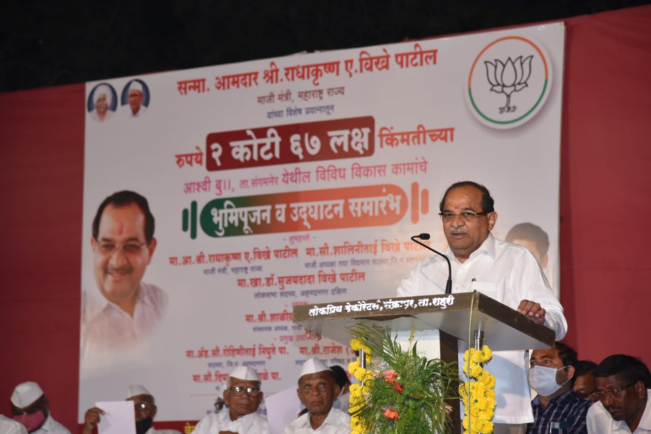 राज्य सरकारवर टिका करताना विखे पाटील म्हणाले की, कोव्हीड संकटात कोणतीही मदत समाज घटकाला हे सरकार करु शकलेले नाही, सरकार फक्त फेसबुकवर दिसत होते. केवळ केंद्राकडे बोट दाखवून मदतीची अपेक्षा करीत राहीले. आघाडी सरकारच्या अडीच वर्षांच्या काळात राज्य विकासापासून मागे गेले आहे. सरकारच्या फक्त घोषणाच सुरु आहेत. एक मंत्री महिलेने आत्महत्या केली म्हणून घरात बसला, गृहमंत्री १०० कोटी रुपयांच्या वसुलीमध्ये जेलमध्ये गेले, आतातर एका मंत्र्याचे थेट दहशदवाद्यांशी आर्थिक संबध उघड झाले तरी या आघाडी सरकारला कोणतीही शरम नाही. देशद्रोही मंत्र्यांची पाठराखन करण्यासाठी मंत्रीच रस्त्यावर उतरायला लागले हे राज्याचे दुर्दैव असल्याचे विखे पाटील म्हणाले.