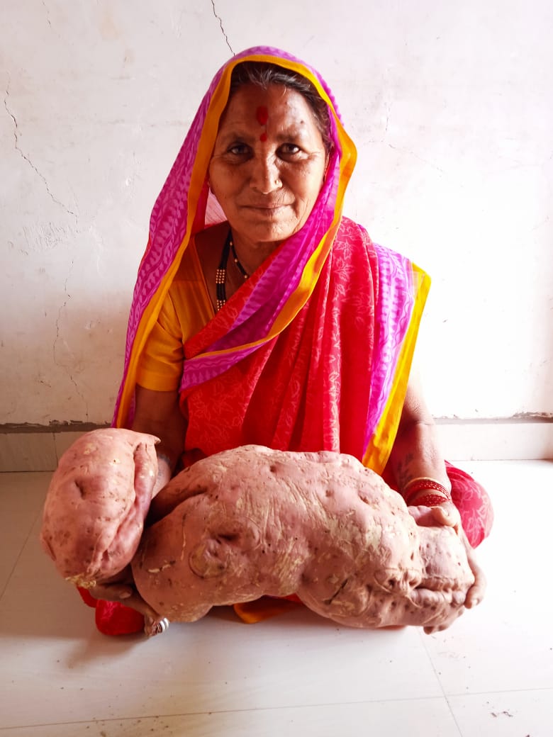 मागील वर्षीच्या खरिपात कांदापीक लावले होते. त्या पिकाच्या कडेला हिराबाई यांनी जमिनीपासून एक फूट उंचीवर एक बांध घातला. जो बांध पूर्ण मुरमाड आहे. तेथे रताळ्याचा वेल लावला होता. जेथे आता तीन चार महिन्यापासून कोणतेही पीक नाही. त्यामुळे तेथे पाणी देण्याचा प्रश्नच नसतांना. त्या एकाच रताळ्याच्या वेलाला जमिनीत सात किलोवजनाचे एकच रताळे (कंद) कोणत्याही प्रकारचे खत, औषध किंवा चार महिन्यापासून पाणी सुद्धा नसतांना मिळाले आहे.