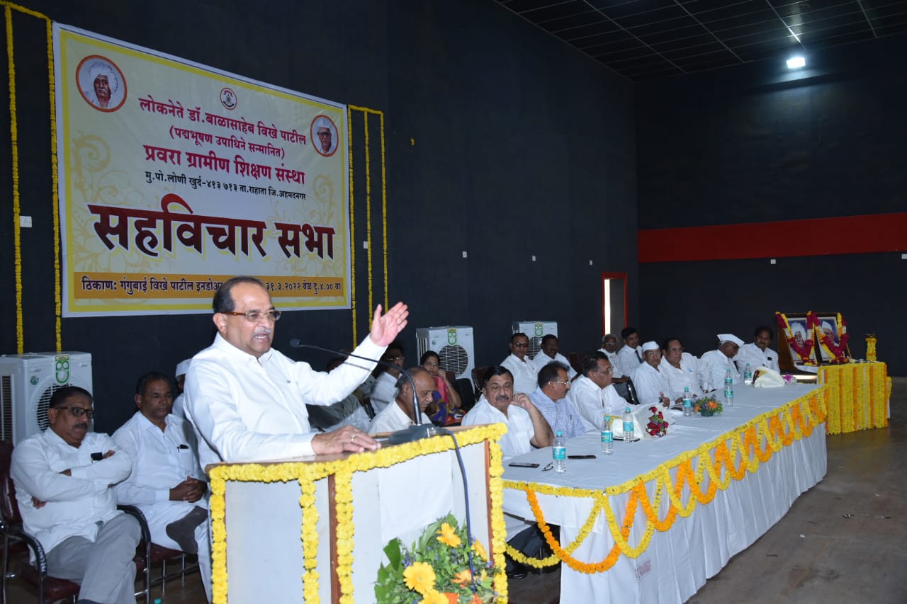 लोकनेते पद्मभूषण डॉ.बाळासाहेब विखे पाटील प्रवरा ग्रामीण शिक्षण संस्थेची सहविचार सभा आमदार विखे पाटील यांच्या अध्यक्षतेखाली आयोजित करण्यात आली होती. याप्रसंगी माजी मंत्री आण्णासाहेब म्हस्के पाटील, संस्थेचे नवनियुक्त संचालक निवृत्त सनदी आधिकारी शिवाजीराव जोंधळे, आण्णासाहेब भोसले, डॉ.भास्करराव खर्डे, शांतीनाथ आहेर, दत्त पाटील शिरसाठ, मच्छिंद्र पावडे, भाऊसाहेब जऱ्हाड, रोहीणी निघुते, ॲड.पोपट वाणी, किशोर नावंदर, संस्थेचे मुख्य कार्यकारी आधिकारी डॉ.शिवानंद हिरेमठ, शिक्षण आधिकारी लिलावती सरोदे आदि याप्रसंगी उपस्थित होते. या सहविचार सभेच्या निमित्ताने विविध क्षेत्रात पीएचडी प्राप्त प्राध्यापकांचा सन्मान तसेच निवृत्त सेवकांचा कृतज्ञता सोहळा संपन्न झाला.