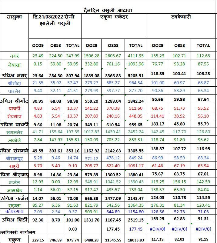 संगमनेर महसूल विभागासाठी १०० टक्के महसूल वसूलीचे उद्दिष्ट देण्यात आले होते. संगमनेर उप विभागाने प्रांताधिकारी शशिकांत मंगरूळे यांच्या नेतृत्वाखाली जिल्ह्यात महसूली वसूलीत अव्वल क्रमांकावर आहे.