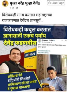 विरोधी पक्ष नेते देवेंद्र फडणवीस यांनी लिहिलेले पुस्तक वाचतानाचा फोटो सोशल मीडियावर व्हायरल करून ‘ज्ञान व अज्ञान यामधील अंतर मिटवणार सुंदर साधन म्हणजे पुस्तक…!