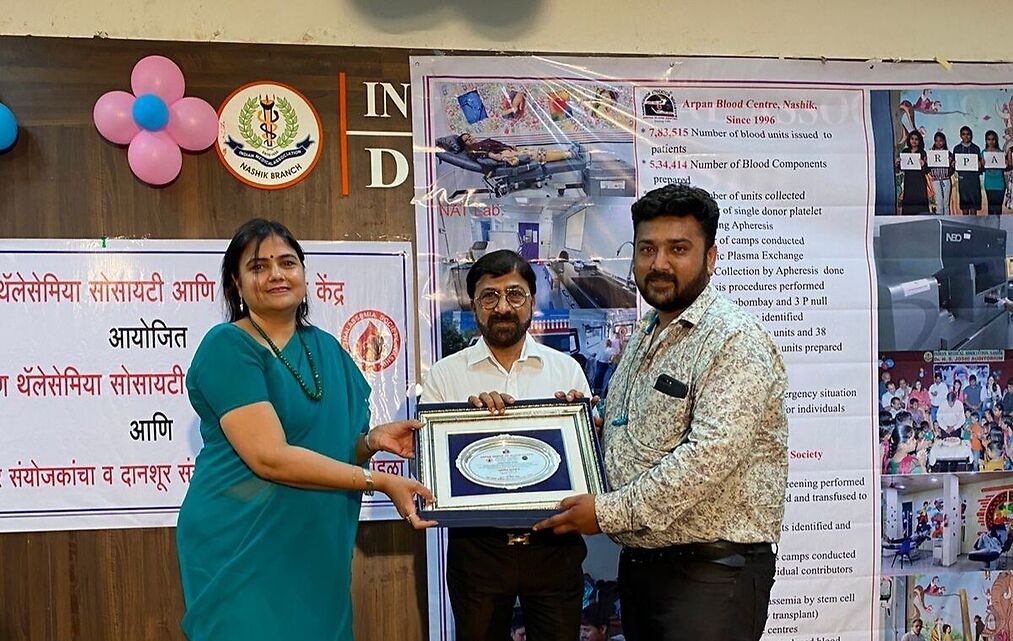 संगमनेर येथील कर्तव्यम् फाऊंडेशनला नाशिक येथील अर्पण थॅलेसेमिया सोसायटी आणि अर्पण रक्त केंद्र यांच्या वतीने ‘रक्त मित्र’ पुरस्कार मुंबई येथील जीतो लेडीज विंग, जीतो अपेक्सच्या अध्यक्षा सुनीता बोहरा व अर्पण थॅलेसेमिया सोसायटीचे अध्यक्ष डॉ. एन. के. तातेड यांच्या हस्ते प्रदान करण्यात आला.