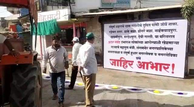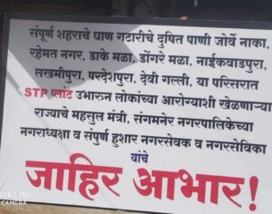 रविवारी महसूल मंत्री बाळासाहेब थोरात यांच्या हस्ते संगमनेर नगर परिषदेच्या विविध विकास कामांचा भूमिपूजनाचा शुभारंभ आणि कामांच्या लोकार्पणाचा कार्यक्रम आयोजित करण्यात आला होता. दिवसभर शहरात विविध ठिकाणी असे कार्यक्रम चालू होते. त्यामध्ये सय्यद बाबा चौकात देखील असाच एक कार्यक्रम करण्यात येणार होता. या कार्यक्रमाचे औचित्य साधत सांडपाणी शुद्धीकरण प्रकल्पाला विरोध करणार्या नागरिकांनी याठिकाणी उपरोधिक भाषेत फलक लावला होता.