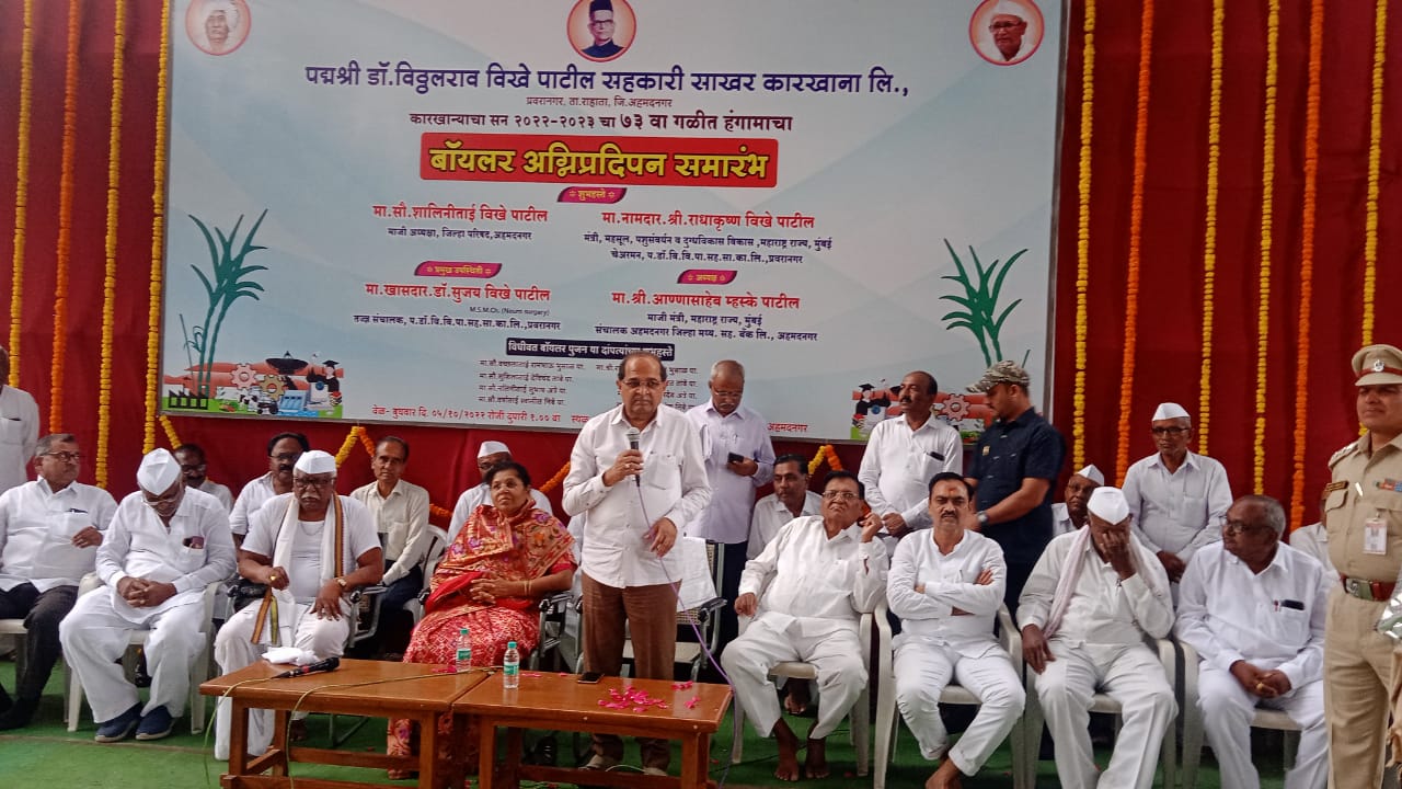 प्रवरानगर येथे पद्मश्री डॉ. विठ्ठलराव विखे पाटील सहकारी साखर कारखान्याच्या ७३ व्या बॉयलर अग्नी प्रदिपन कार्यक्रमात विखे पाटील बोलत होते. माजी मंत्री अण्णासाहेब म्हस्के पाटील यांच्या अध्यक्षतेखाली झालेल्या कार्यक्रमास जिल्हा परिषदेच्या माजी अध्यक्षा शालिनी विखे पाटील, भाजपाचे जिल्हा अध्यक्ष राजेंद्र गोंदकर, तालुका अध्यक्ष ज्ञानेश्वर गोंदकर, बारामती तालुक्याचे भाजपा अध्यक्ष पाडुरंग कचरे, प्रवरा बँकेचे अध्यक्ष अशोकराव म्हसे, ट्रक सोसायटीचे अध्यक्ष नंदूशेठ राठी, उपाध्यक्ष सुनिल जाधव, भाजीपाला सोसायटी च्या अध्यक्षा गिता थेटे कारखान्याचे उपाध्यक्ष विश्वासराव कडु, गणेश कारखान्याचे अध्यक्ष मुंकूदराव सदाफळ, कार्यकारी संचालक अभिजित भागडे आदी उपस्थित होते.