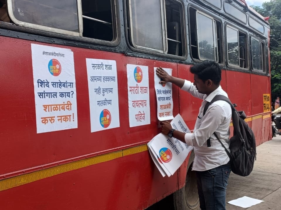 जिल्हा परिषदेच्या १७ हजार मराठी शाळा बंद करण्याच्या हालचाली महाराष्ट्र सरकारच्या सुरू असल्याने त्याविरुद्ध वेगवेगळी आंदोलन सुरू आहेत. आज छात्र भारतीय विद्यार्थी संघटनेच्या वतीने संगमनेर बस स्थानकांमध्ये मराठी शाळा बंदीच्या निषेधार्थ १०० एसटी बसेसवर निषेधाचे पोस्टर्स चिकटविण्यात आले.