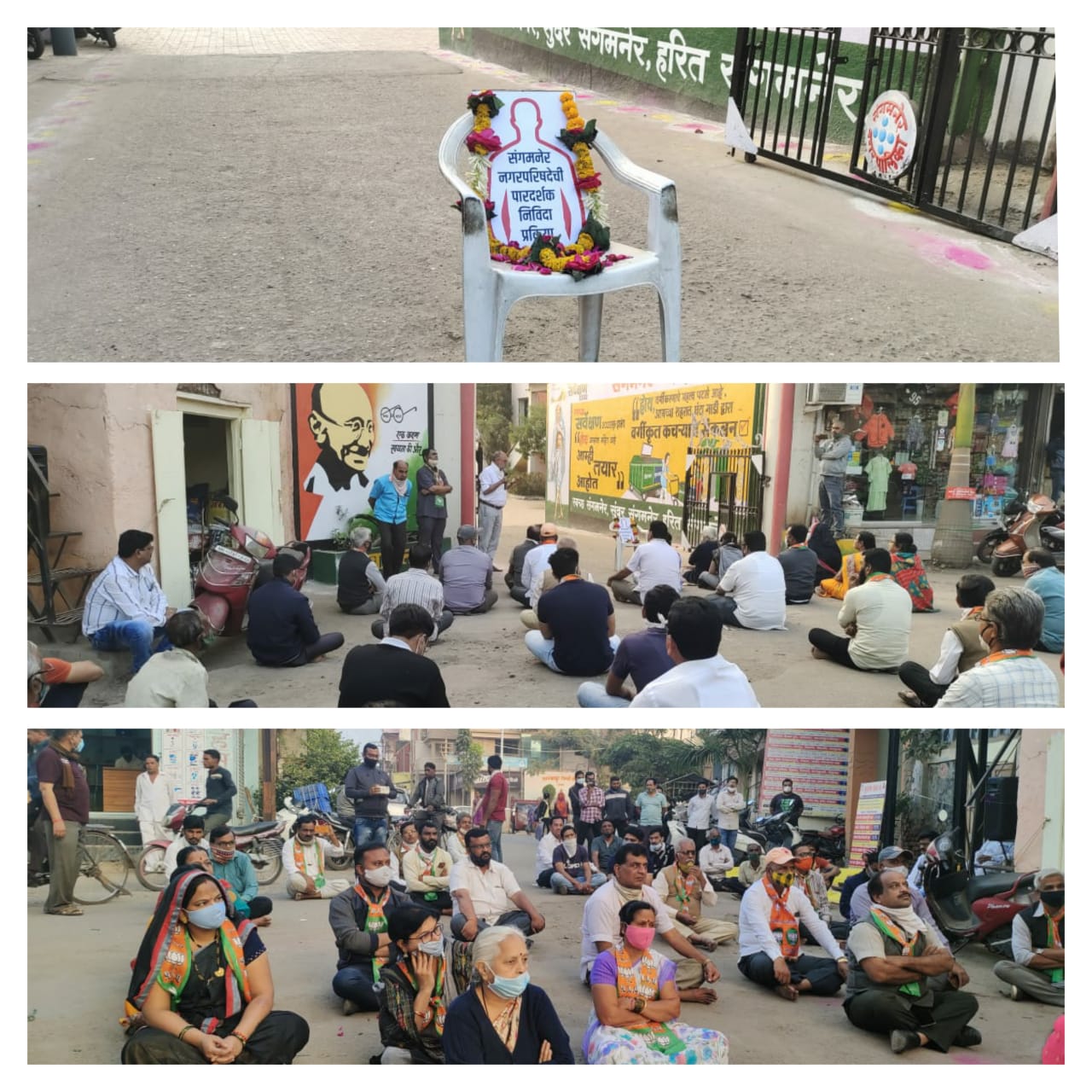 संगमनेर अमरधाम बोगस टेंडर प्रकरण राजकीय दृष्ट्या ऐरणीवर आलेले असताना आज शहर भाजपच्या वतीने गैरव्यवहाराच्या आरोपात वैकुंठवासी झालेल्या बोगस टेंडरची प्रतीकात्मक अंत्ययात्रा काढण्यात येणार होती. मात्र कोरोना निर्बंधांमुळे प्रशासनाकडून अंत्ययात्रेस परवानगी मिळाली नाही. त्यामुळे नगरपरिषदेच्या प्रवेशद्वारासमोर वैकुंठवासी बोगस टेंडरची शोकसभा घेण्यात आली.