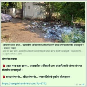 स्वच्छ संगमनेर, सुंदर संगमनेर, हरित संगमनेर नगरपालिकेचे नुसतेच बोलबच्चन… ‘आता मात्र कहर झाला, प्रांत अधिकाऱ्यांच्या बंगल्या शेजारीच कचराकुंडी’ अशा मथळ्याचे वृत्त संगमनेर टाइम्स न्यूज पोर्टलवर आज प्रसिद्ध झाले.