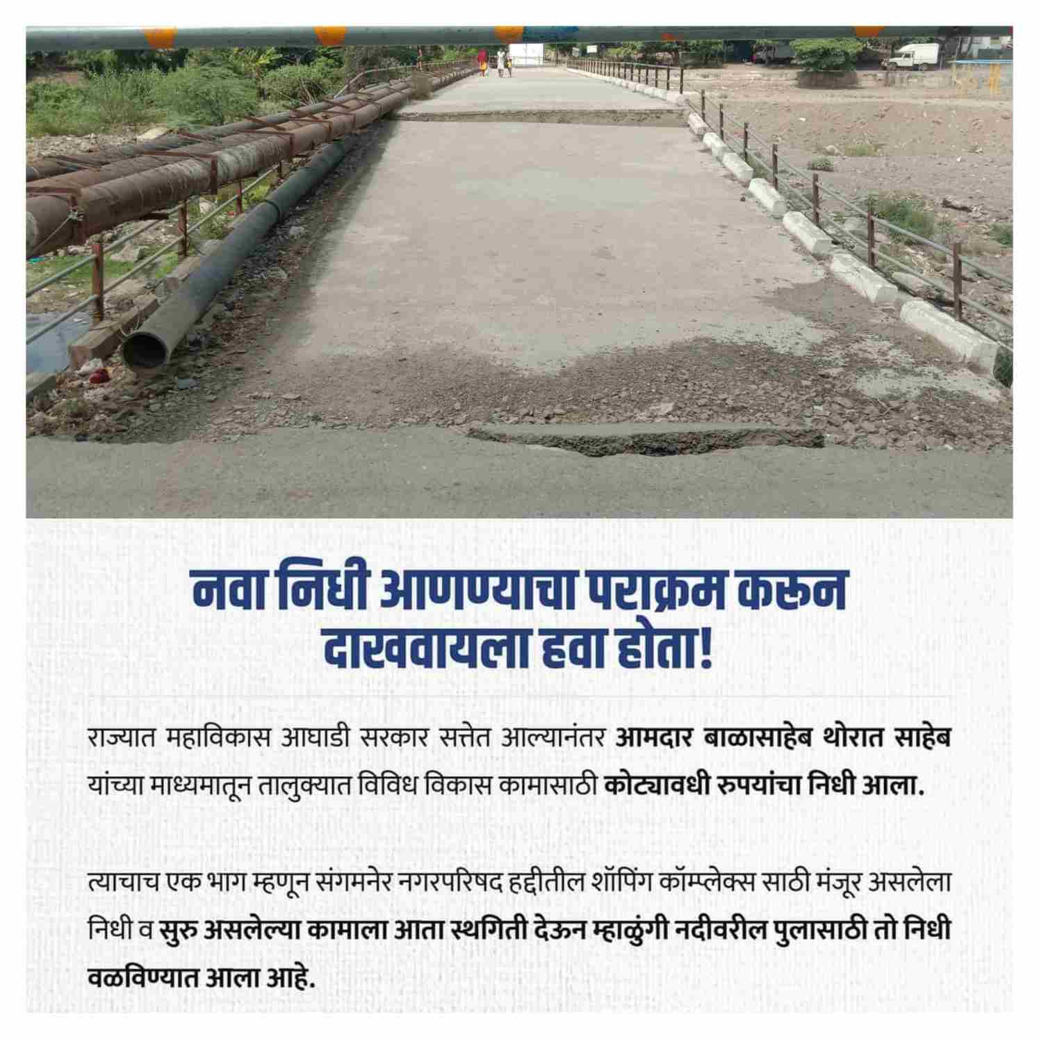 त्याचाच एक भाग म्हणून संगमनेर नगरपरिषद हद्दीतील शॉपिंग कॉम्प्लेक्स साठी मंजूर असलेला निधी व सुरु असलेल्या कामाला आता स्थगिती देऊन म्हाळूंगी नदीवरील पुलासाठी तो निधी वळविण्यात आला आहे.