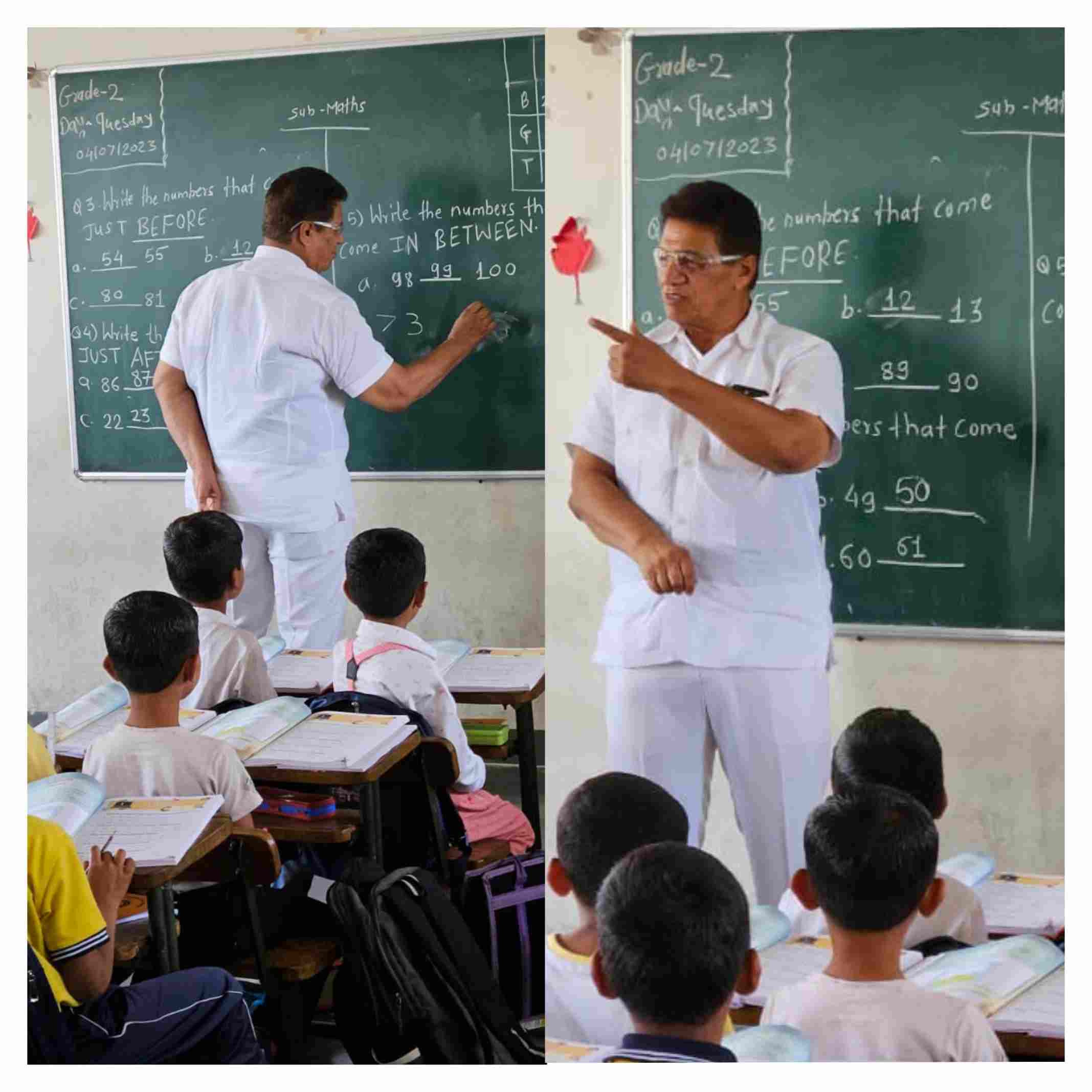 या विद्यालयाच्या पाहणी करताना माजी आमदार डॉ. तांबे यांनी तिसरीच्या वर्गात विद्यार्थ्यांशी संवाद साधताना त्यांना गणित हा विषय शिकवला.