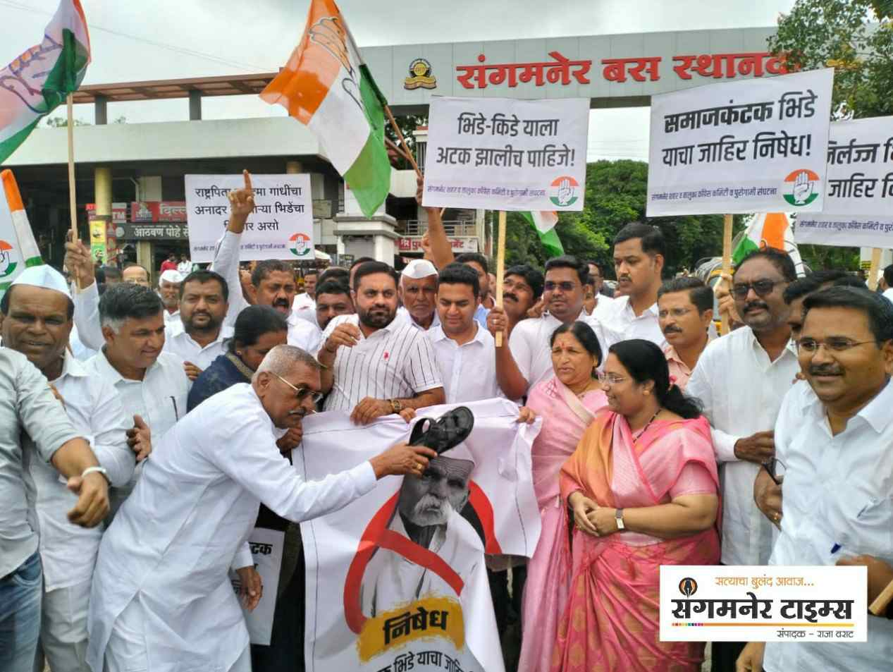 संगमनेर बस स्थानक येथे संभाजी भिडे विरोधात काँग्रेसच्या वतीने तीव्र आंदोलन झाले. यावेळी दुर्गा तांबे, शहराध्यक्ष सोमेश्वर दिवटे, आर.बी. रहाणे, रामहरी कातोरे, नवनाथ अरगडे, निखिल पापडेजा, नितीन अभंग, दिलीप जोशी, गजेंद्र अभंग, सुरेश थोरात, जावेद शेख, पद्मा थोरात, अर्चना बालोडे, सुनंदा जोर्वेकर, संतोष हासे, संपत डोंगरे, गणेश मादास, दत्तू कोकणे, सुरेश झावरे, नवनाथ आंधळे, अनिकेत घुले, आदींसह विविध सेलचे पदाधिकारी व कार्यकर्ते मोठ्या संख्येने उपस्थित होते. यावेळी संभाजी भिडे याच्या विरोधात विविध घोषणा देत तीव्र निषेध नोंदवण्यात आला.
