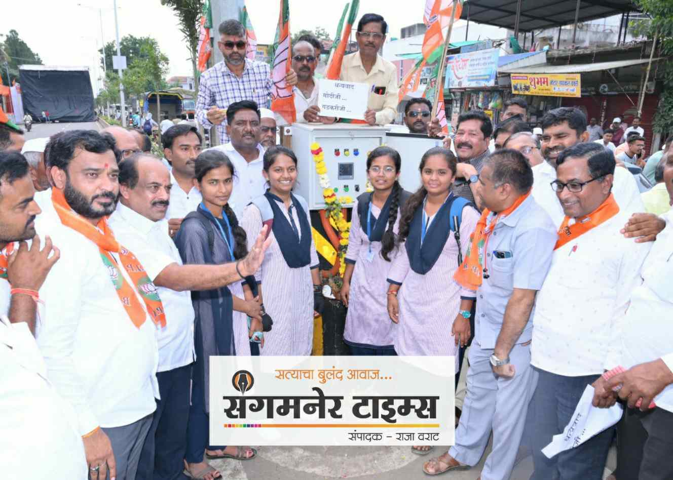 महाविद्यालयीन विद्यार्थीनींच्या हस्ते शहरातून जाणाऱ्या जुन्या पुणे नासिक महामार्गावरील पथदिव्यांचे उद्घाटन करून संगमनेर भारतीय जनता पक्ष आणि नागरीकांनी केंद्र सरकारप्रती कृतज्ञता व्यक्त केली. धन्यवाद मोदीजी फलकही लावण्यात आले आहेत.