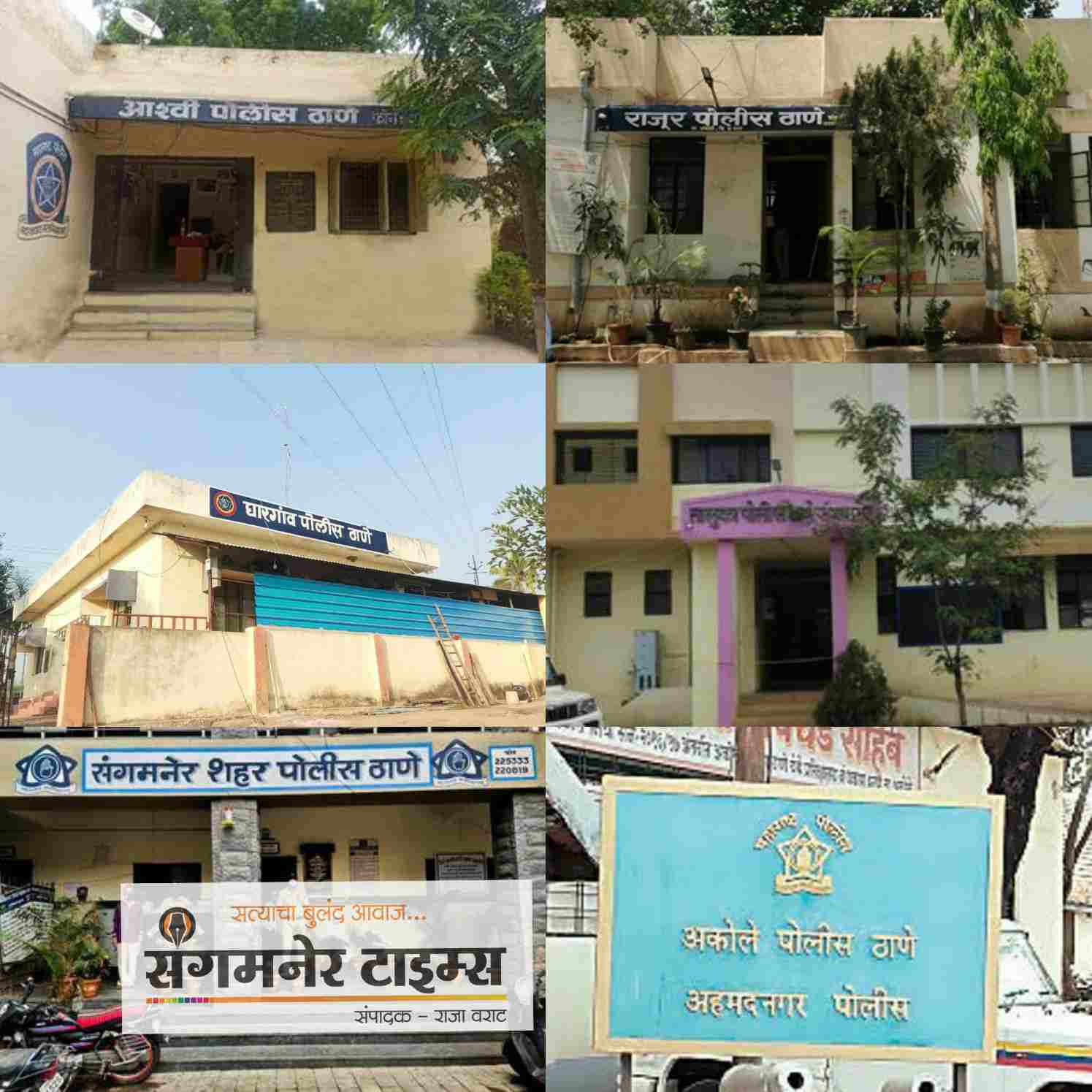 संगमनेर तालुका (ग्रामीण), संगमनेर शहर, आश्वी, आणि घारगाव असे चार पोलीस ठाणे संगमनेर तालुक्यामध्ये आहेत. तर राजुर, अकोले (शहर व ग्रामीण) हे अकोले तालुक्यातील पोलीस ठाणे आहेत. तालुक्यामध्ये होणाऱ्या विविध अवैध घडामोडी, चोऱ्या, घरफोडी, दरोडे, अवैध व्यवसाय, अवैध प्रवासी वाहतूक, हाणामाऱ्या, खुन, महिलांवरील अत्याचार, यावर आळा बसावा म्हणून चार चार ठिकाणी पोलीस ठाणे करण्यात आले.