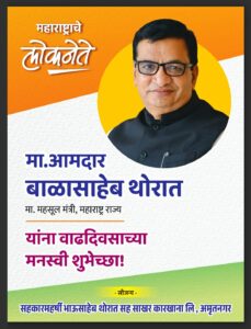 संकटाबरोबर लढतांना सामान्य माणूस केंद्रबिंदू मानले. विकास कामांचा धडाका सुरु ठेवला. अशा अडचणीत कठीण प्रसंगात ना.थोरात यांची कार्यपध्दती,संयम,दुरदृष्टी,मदत कार्य हे सगळया राज्याने पाहिले. जनसामान्यांसाठी लढणारा हा राजकारणातील राजहंस कठीण प्रसंगी गोरगरिबांसाठी बाजीप्रभू होवून मदतीसाठी धावले. अशा या महाराष्ट्राच्या प्रभावी नेतृत्व व यशस्वी प्रदेशाध्यक्ष ठरलेले नामदार बाळासाहेब थोरात साहेब यांना वाढदिवसानिमित्त कोटी कोटी शुभेच्छा…