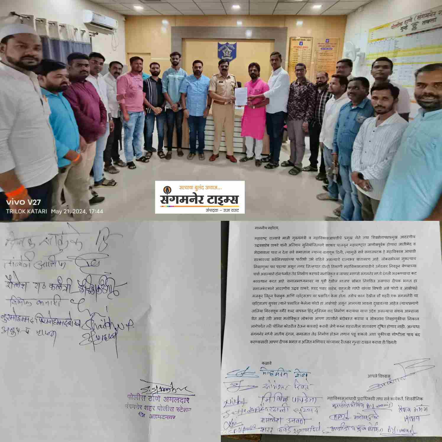 नगर जिल्ह्यात दोन्ही ठिकाणी महाविकासआघाडीचे उमेदवार निवडून येण्याच्या चर्चा असल्याने दोन धर्मात तेढ निर्माण करणारे मनोविकृत माणसे संगमनेरमध्ये दंगली घडविण्याचे कट कारस्थान करत आहेत. समाजमाध्यमावर यापूर्वीदेखील दीपक भगत व मणियार यांनी उद्धव ठाकरे, शरद पवार, राहुल गांधी यांच्याविषयी असे फोटो व आक्षेपार्ह मजकूर लिहून फेसबुक आणि व्हॉट्सअपवर प्रसारित केला होते. तसेच “सौ शहरी एक संगमनेरी” या व्हॉट्सअप ग्रुपवर त्याने प्रसारित केलेला फोटो हा आक्षेपार्ह असून आमच्या भावना दुखावल्या आहेत. त्याचप्रमाणे ताजिया, मिरवणूक वगैरे शब्द वापरुन हिंदू-मुस्लिम वाद निर्माण करायचा याचा उद्देश असल्याचा संशय आम्हाला येत आहे. तरी अश्या मनोविकृत लोकांचा आपण तातडीने बंदोबस्त करावा. जेणेकरुन शहरातील वातावरण दूषित होणार नाही. अन्यथा संगमनेरमध्ये जातीय दंगल, समाजात तेढ निर्माण होऊन तणाव घडू शकतो अशा चुकीच्या गोष्टीला पायबंद बसावा यासाठी या समाजकंटकांवर गुन्हा दाखल करावा.