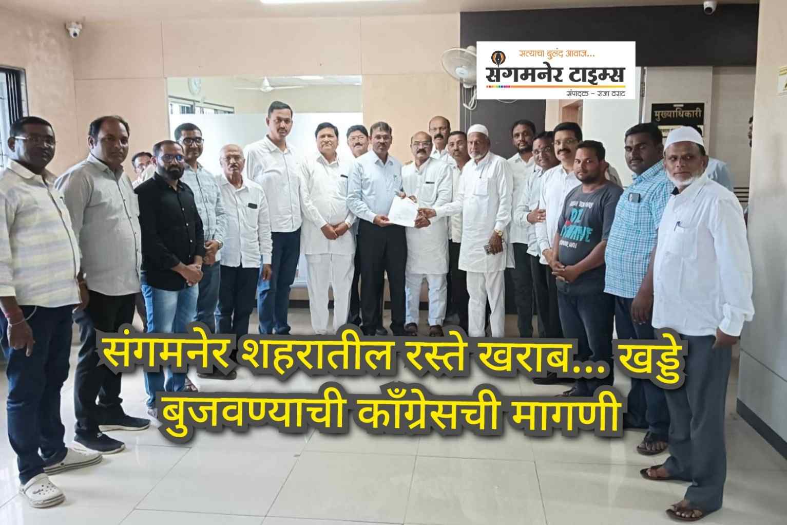 संगमनेर शहरातले रस्ते खराब झाले असून त्यावर खड्डे पडले आहेत. सणासुदीच्या काळात हे रस्ते दुरुस्त करून खड्डे बुजवावेत. तसेच नगरपालिकेच्या अखत्यारित असणाऱ्या घनकचरा व्यवस्थापन, स्ट्रीट लाईट, पार्किंग व्यवस्था याबाबतच्या सर्व अडचणी आणि पालिकेच्या व्यवस्थापनाकडून होणारी जनतेची अडवणूक याबाबत योग्य ती कार्यवाही करण्यासाठी काँग्रेस पक्षाच्या पदाधिकाऱ्यांनी आणि माजी नगरसेवकांनी संगमनेर नगरपालिकेच्या मुख्याधिकाऱ्यांना निवेदन दिले आहे.