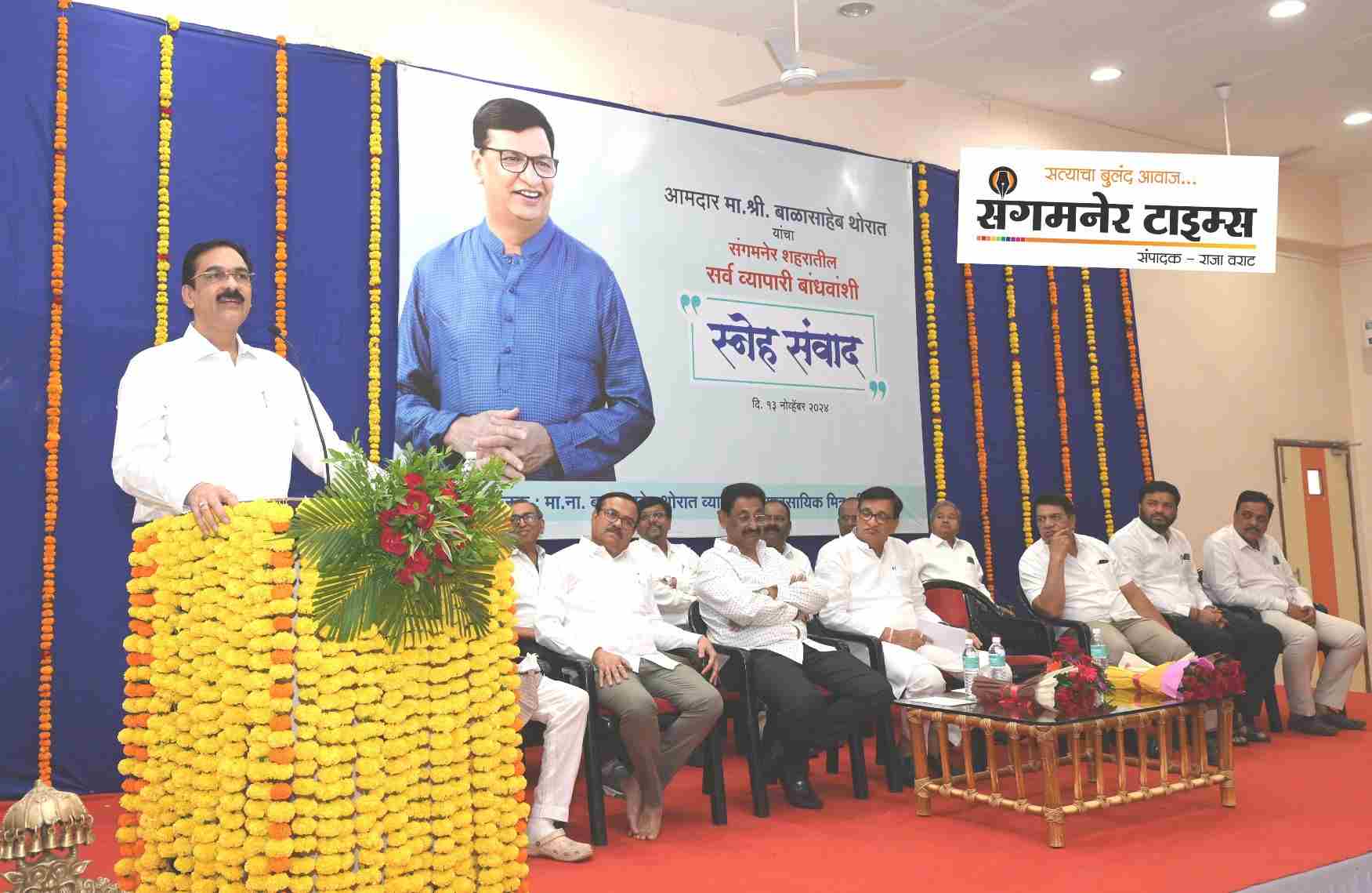 मालपाणी लॉन्स येथे संगमनेर मधील व्यापारी बांधवांच्या संवाद मेळाव्यात ते बोलत होते. यावेळी व्यासपीठावर आमदार बाळासाहेब थोरात, माजी आमदार डॉ. सुधीर तांबे, व्यापारी असोसिएशनचे अध्यक्ष योगेश कासट, डॉ.जयश्री थोरात, प्रकाश कलंत्री, निलेश जाजू, ओंकार भंडारी, सोमेश्वर दिवटे, कल्पेश मेहता ,कैलास सोमाणी, सुभाष ताजने, राणी प्रसाद मुंदडा आदींसह संगमनेर शहरातील व्यापारी मोठ्या संख्येने उपस्थित होते.