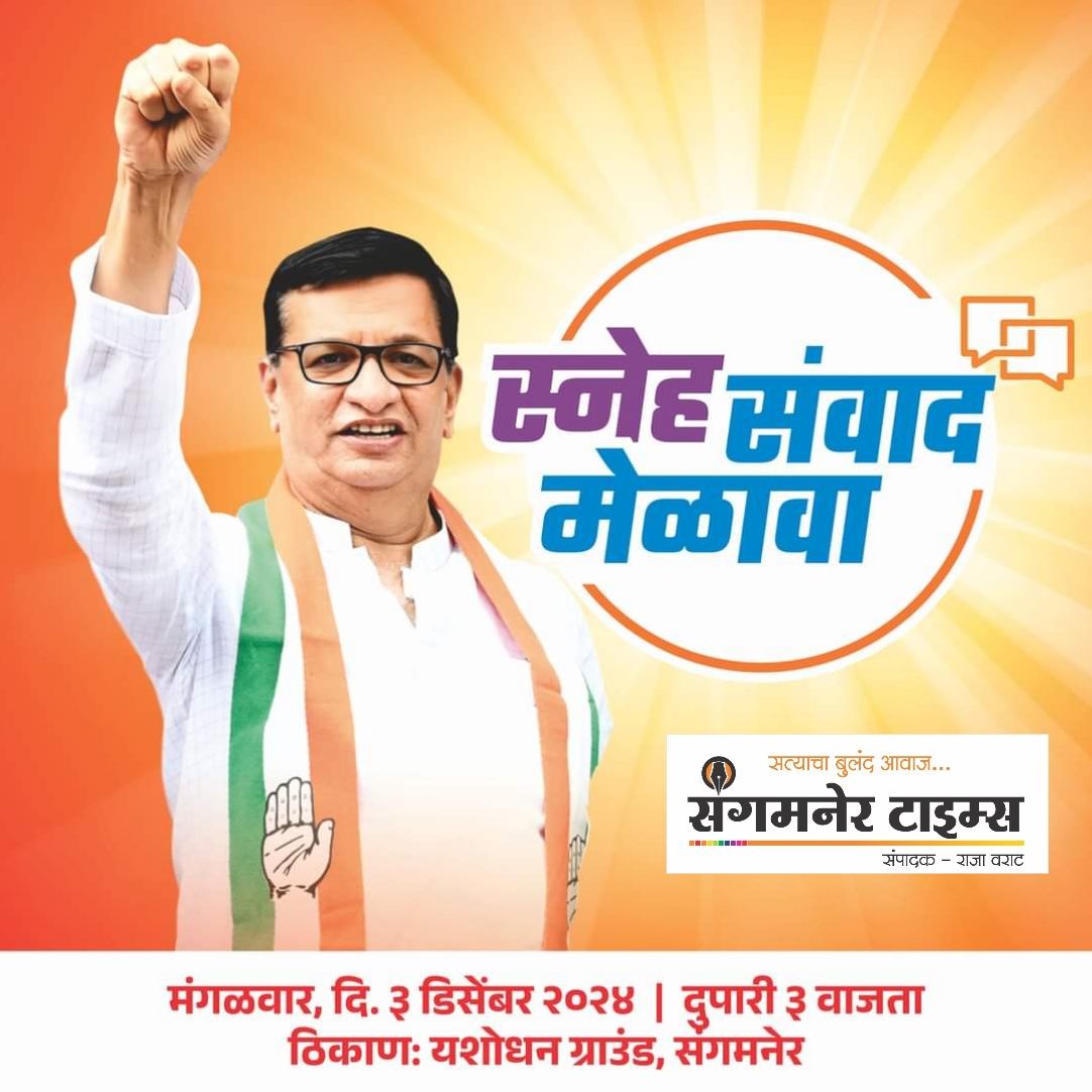 नुकत्याच झालेल्या विधानसभा निवडणुकीच्या पार्श्वभूमीवर काँग्रेसच्या राष्ट्रीय वर्किंग कमिटीचे सदस्य लोकनेते बाळासाहेब थोरात यांच्या उपस्थितीमध्ये मंगळवार दिनांक 3 डिसेंबर 2024 रोजी दुपारी 3 वा. यशोधन शेजारील ग्राउंडवर कार्यकर्त्यांचा स्नेहसंवाद मेळावा आयोजित करण्यात आले असल्याची माहिती माजी आमदार डॉ. सुधीर तांबे यांनी दिली आहे.