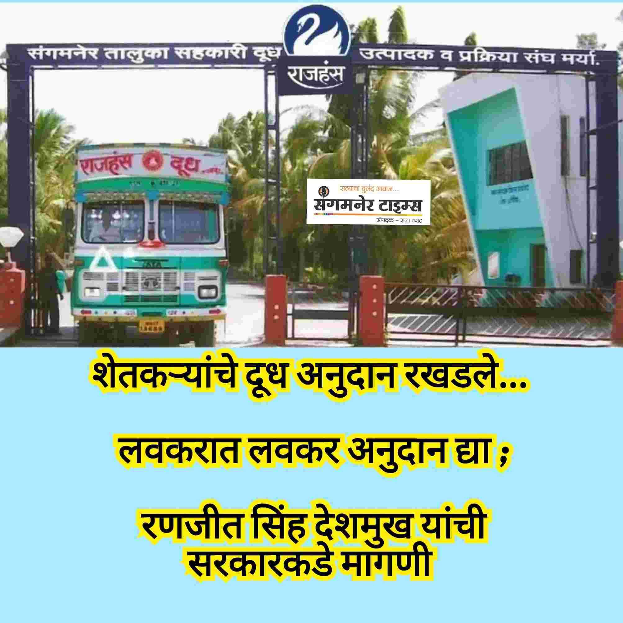 ऑक्टोबर व नोव्हेंबर या महिन्यांचे अनुदान दूध उत्पादकांना अद्याप मिळालेले नाही. त्यामुळे शासनाने दूध उत्पादकांना प्रति लिटर ७ रुपये अनुदान देण्याबाबत तात्काळ कार्यवाही करावी व माहे डिसेंबरपासून पुढील कालावधीकरिता ही अनुदान योजना चालु ठेवावी, अशी मागणी संगमनेर तालुका दूध संघाचे चेअरमन रणजितसिंह देशमुख यांनी केली आहे.