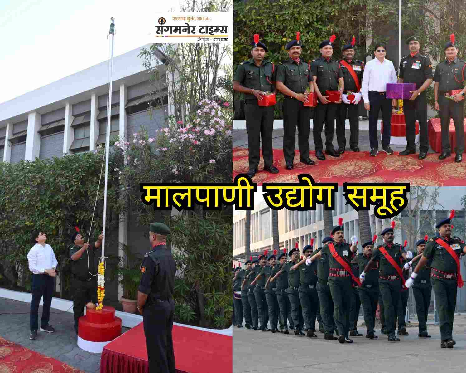 मालपाणी यांच्या हस्ते ध्वजवंदन आणि ध्वजारोहण करण्यात आले. सुरक्षा विभागाच्या घोष पथकाने शिस्तबद्ध संचलन सादर करून तिरंग्यास मानवंदना दिली. विविध घटनांमध्ये प्रामाणिकपणे आपली जबाबदारी पार पाडणारे सुरक्षा विभागातील जवान चैतन्य भोकनळ, धनंजय आव्हाड, जयप्रकाश कातोरे, सागर कानवडे, दत्तू काळे यांचा भेटवस्तू व पुष्पगुच्छ देऊन सत्कार करण्यात आला.शिस्तबद्ध परेडचे यशस्वी नेतृत्व केल्याबद्दल शरद कानवडे यांचा सत्कार करण्यात आला. तीन वर्षांपासून सुरक्षा विभागाला खंबीर नेतृत्व देणारे विभाग प्रमुख भारत मोरे यांचा विशेष सत्कार गिरिश मालपाणी यांच्या हस्ते करण्यात आला. कार्यक्रमाचे प्रास्ताविक आणि सूत्रसंचालन करणारे मुरारी देशपांडे यांनी देशभक्तीपर आवेशपूर्ण कविता सादर केली तर आभार मेजर बाळकृष्ण अरगडे यांनी केले. कार्यक्रमासाठी मालपाणी उद्योग समुहातील कामगार बंधू भगिनी स्टाफ सहकारी मोठ्या संख्येने उपस्थित होते. मालपाणी इस्टेट च्या आवारात छान सजावट करण्यात आली होती.