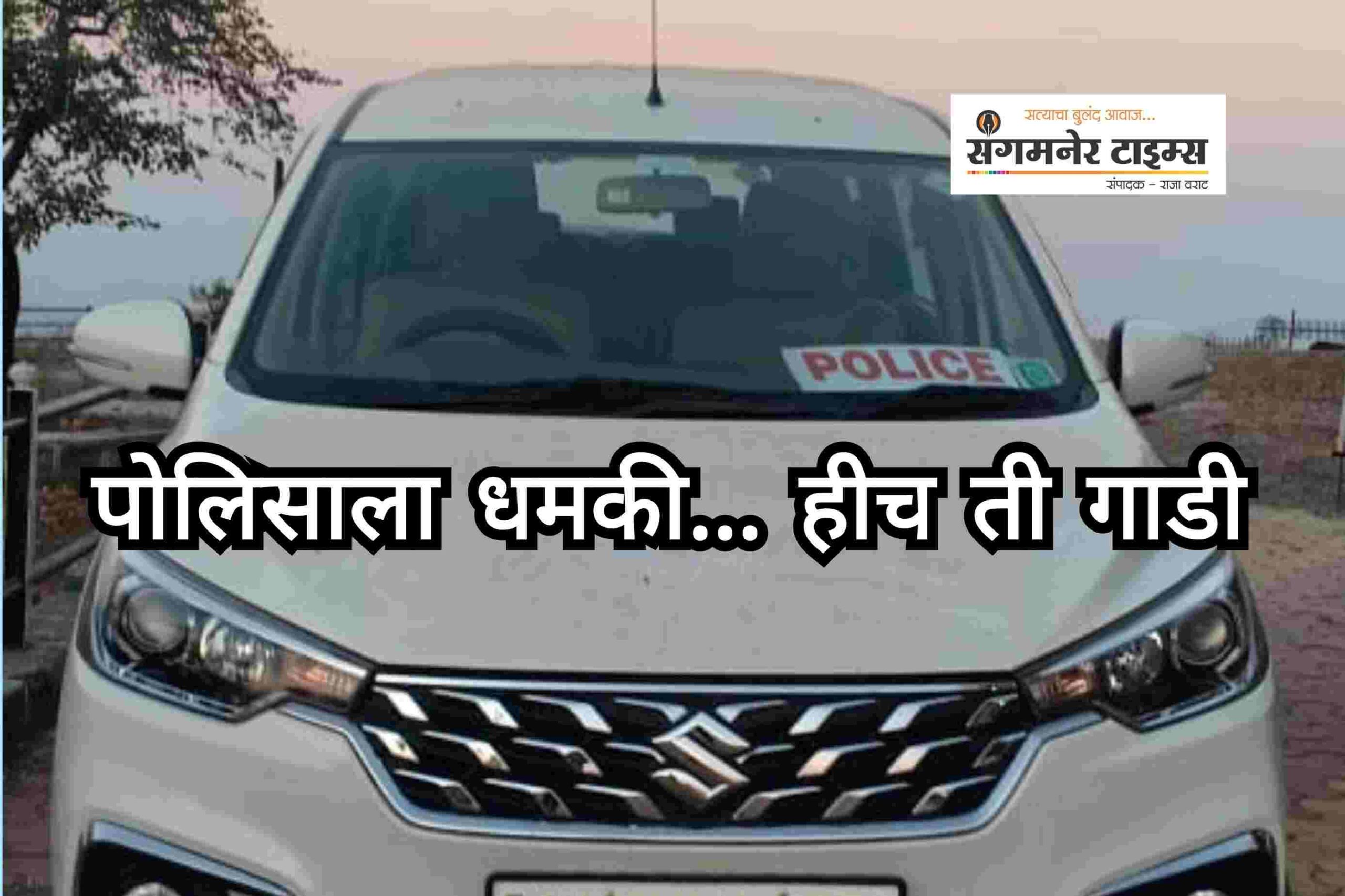 संगमनेर तालुक्यातील पठार भागात असणाऱ्या श्री बाळेश्वर मंदिरातील पोलीस यंत्रणेच्या बिनतारी संदेश व्यवस्थेसाठी ड्युटीवर असणाऱ्या पोलीस हेडकॉन्स्टेबलला दमदाटी करण्याचा प्रकार झाला असून दमदाटी, शिवीगाळ आणि मारण्याची धमकी देणारे हे खासगी गाडीला पोलीस नावाचा फलक लावून आलेले होते.