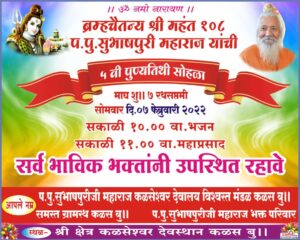 अकोले तालुक्यातील कळस येथील प.पु. सुभाषपूरी महाराज यांच्या पुण्यतिथी निमित्ताने ७ फेब्रुवारी रोजी विविध कार्यक्रम आयोजन