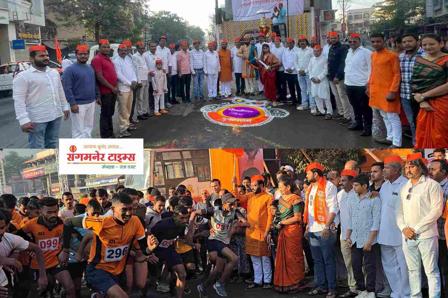 जयंती निमित्त अठरा वर्षाच्या पुढील मुलांच्या गटासाठी छत्रपती शिवाजी स्मारक ते घुलेवाडी फाटा आणि मुलीच्या गटासाठी छत्रपती शिवाजी महाराज स्मारक ते संगमनेर विधी महाविद्यालय मॅरेथॉन स्पर्धा घेण्यात आल्या..या मॅरेथॉन स्पर्धेत पुरुष गटात प्रथम क्रमांकाचे पारितोषिक रोहित बिन्नर, द्वितीय क्रमांक ऋषिकेश वावरे, तृतीय क्रमांक दिनेश गुंजाळ, चतुर्थ क्रमांक सुनील गिऱ्हे, पंचम क्रमांक तुषार खुळे, तसेच मुलींच्या मोठ्या गटामध्ये प्रथम क्रमांक खुशी हासे, द्वितीय क्रमांक प्रणाली पोटकुले, तृतीय क्रमांक सरगम कासार, चतुर्थ क्रमांक वैष्णवी खताळ आणि पंचम क्रमांक सारिका लोगोटे व पुनम वाव्हळ यांना तरलहान गट मुली श्रेया सानप, सानिका पवार, सार्थक गुंजाळ यांना सन्मानपत्र व सन्मानचिन्ह तसेच आकर्षक बक्षिसे देऊन गौरव करण्यात आले.