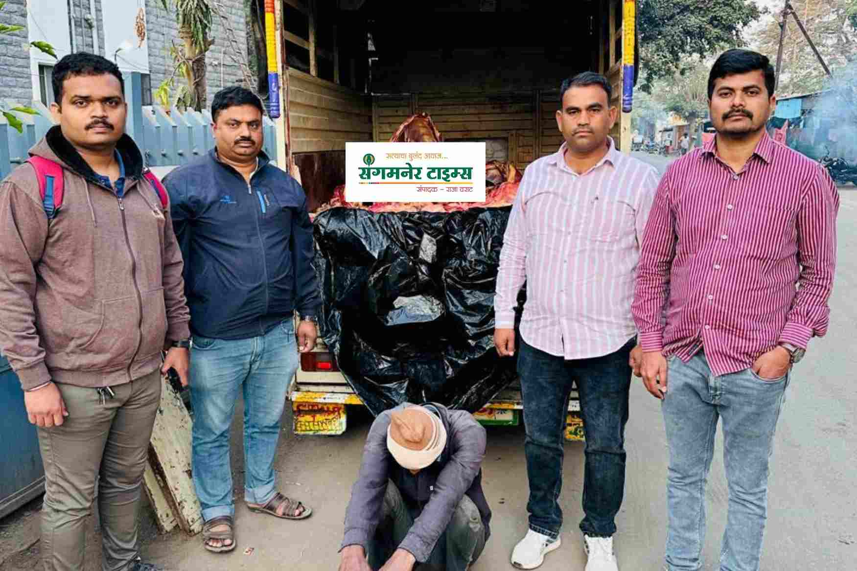 पथकाने घटनाठिकाणावरून 3,60,000/- रू किं.त्यात 1200 किलो गोमांस, 60,000/- रू किं.त्यात तीन गोवंशी जातीचे कालवडी, 2,000/- रू किं.वजन काटा, 700/- रू किं. लोखंडी कुऱ्हाड व सुरा व 5,00,000/- रू किं. टाटा कंपनीचा टेम्पो क्रमांक एमएच-14-एफटी-1450 असा एकुण 9,22,700/- रू किंमतीचा मुद्देमाल जप्त केला आहे. आरोपीविरूध्द संगमनेर शहर पोलीस स्टेशन गु.र.नं. 133/2025 बीएनएस 2023 चे कलम 271, 325, 3 (5) वगैरे प्रमाणे गुन्हा दाखल करण्यात आला आहे.