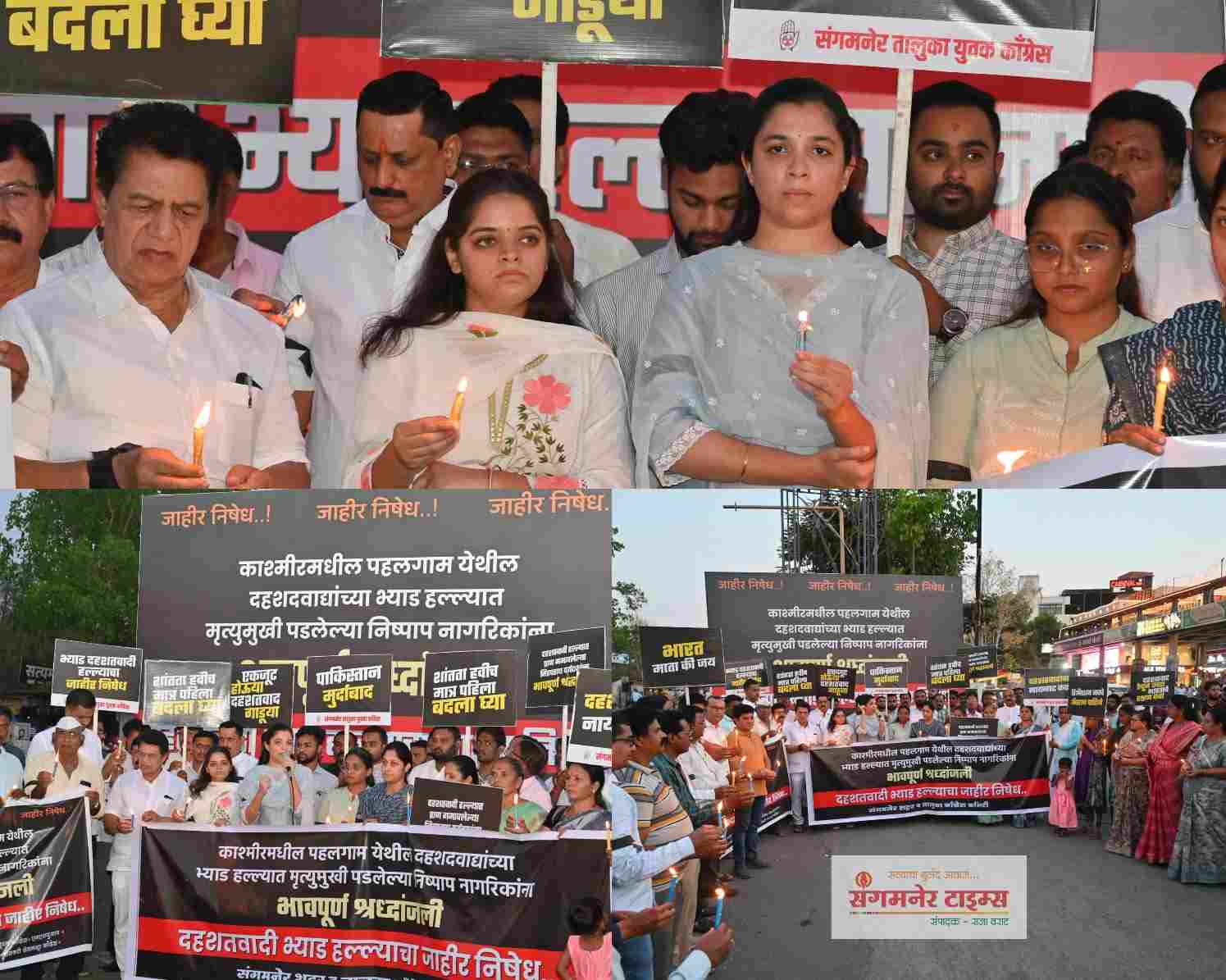 वंदे मातरम, भारत माता की जय, भ्याड अतिरेकी हल्ल्याचा निषेध असो, मुर्दाबाद मुर्दाबाद पाकिस्तान मुर्दाबाद या घोषणा देत संगमनेर काँग्रेसच्या वतीने पहलगाम येथे झालेल्या अतिरेकी हल्ल्याचा कॅण्डल मार्च करून तीव्र निषेध करण्यात आला. याच बरोबर या अतिरेक्यांना मृत्युदंडाची शिक्षा द्या अशी मागणी माजी आमदार डॉ.सुधीर तांबे यांनी केली असून भारतीय म्हणून अशा वेळेस सर्वांनी एकत्र या असे आवाहन डॉ. जयश्री थोरात यांनी केले आहे.