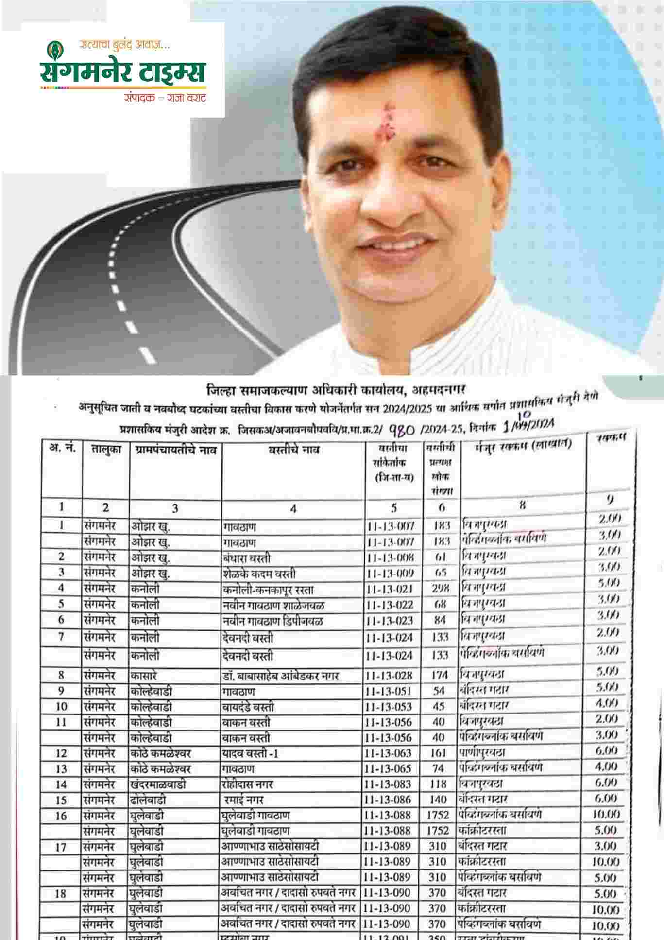 या कामाची प्रशासकीय मान्यता प्रशासकीय मंजुरीचे आदेश क्रमांक जीसकअ/ प्रमा क्रमांक 2/980 /2024–25 दि. 1 ऑक्टोबर 2024 रोजी मंजूर करण्यात आले आहे. या कामांमध्ये घुलेवाडी गावठाण येथील पेव्हिंग ब्लॉक बसवणे, रस्ता कॉंक्रिटीकरण करणे, बंदिस्त गटार, रस्ता डांबरीकरण, म्हसोबा नगर मधील विविध विकास कामे, वीज पुरवठा अशा कामांचा समावेश आहे. या सर्व कामांसाठी थोरात यांनी 2 कोटी रुपयांचा निधी मंजूर करून घेतला होता. आणि त्यासाठी मंजुरी सुद्धा मिळाली आहे आणि त्या निधीतील ही सर्व काम आहेत.