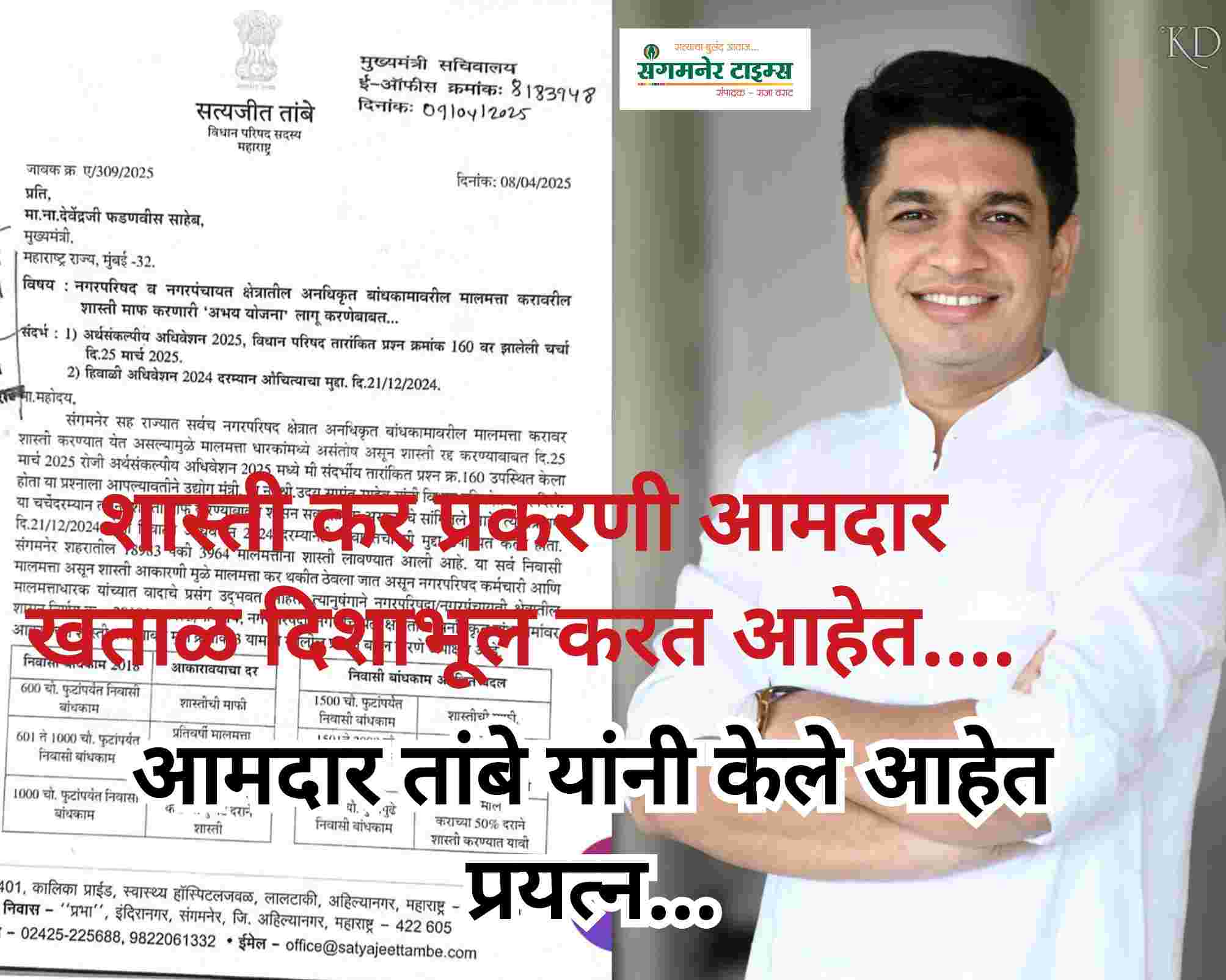 नितीन अभंग यांनी दिलेल्या प्रसिद्धी प्रत्येक म्हटले आहे की, संगमनेर नगरपरिषदेने शहरातील सर्व शास्ती कर माफ करण्यात यावा यासाठी सभागृहात वेळोवेळी ठराव केले आहे. व हे ठराव मा. जिल्हाधिकारी यांच्याकडे सादर केलेले आहेत. तसेच अनाधिकृत बांधकामावरील शास्ती व 2% शास्तीकर माफ व्हावा यासाठी आमदार सत्यजीत तांबे यांनी मुख्यमंत्री देवेंद्र फडणवीस, उपमुख्यमंत्री तथा नगर विकास मंत्री एकनाथ शिंदे व उपमुख्यमंत्री अजित पवार यांच्याकडे आणि वेळोवेळी शासन दरबारी पाठपुरावा केला आहे. याचबरोबर 8 एप्रिल 2025 रोजी या मागणीचे पत्रही शासनाला दिले आहे. या समवेत विधान परिषदेचे आवाज उठवला होता